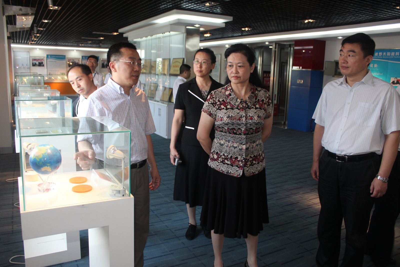 姚燕一行首先深入实地,调研了成都中光电阿波罗5兆瓦碲化镉薄膜太阳能电池中试线、项目规划与建设用地情况,参观了公司股东四川阿波罗太阳能科技有限责任公司的产品展室和材料生产车间。随后,听取了成都中光电阿波罗组织架构、生产线项目情况、生产运营及人才队伍等方面情况的汇报。彭寿表示,成都中光电阿波罗成立2年以来,主要围绕5兆瓦试验线进行技术摸索及对生产技术人员的培养,为80兆瓦碲化镉薄膜太阳能电池生产线做好了前期的技术和人员储备。