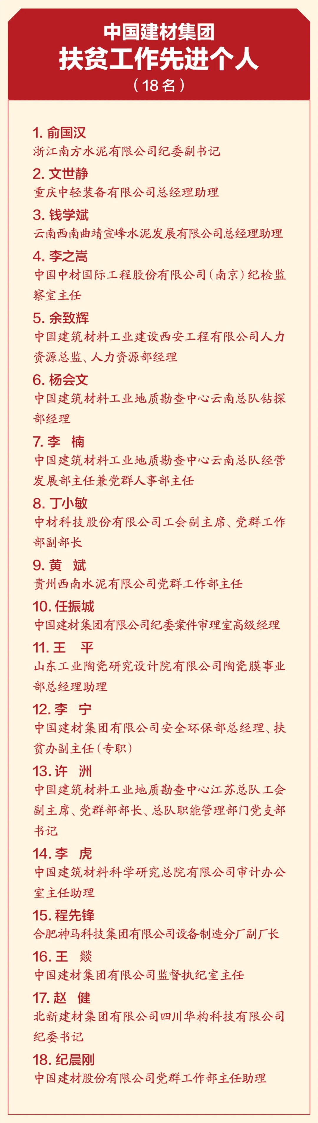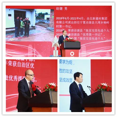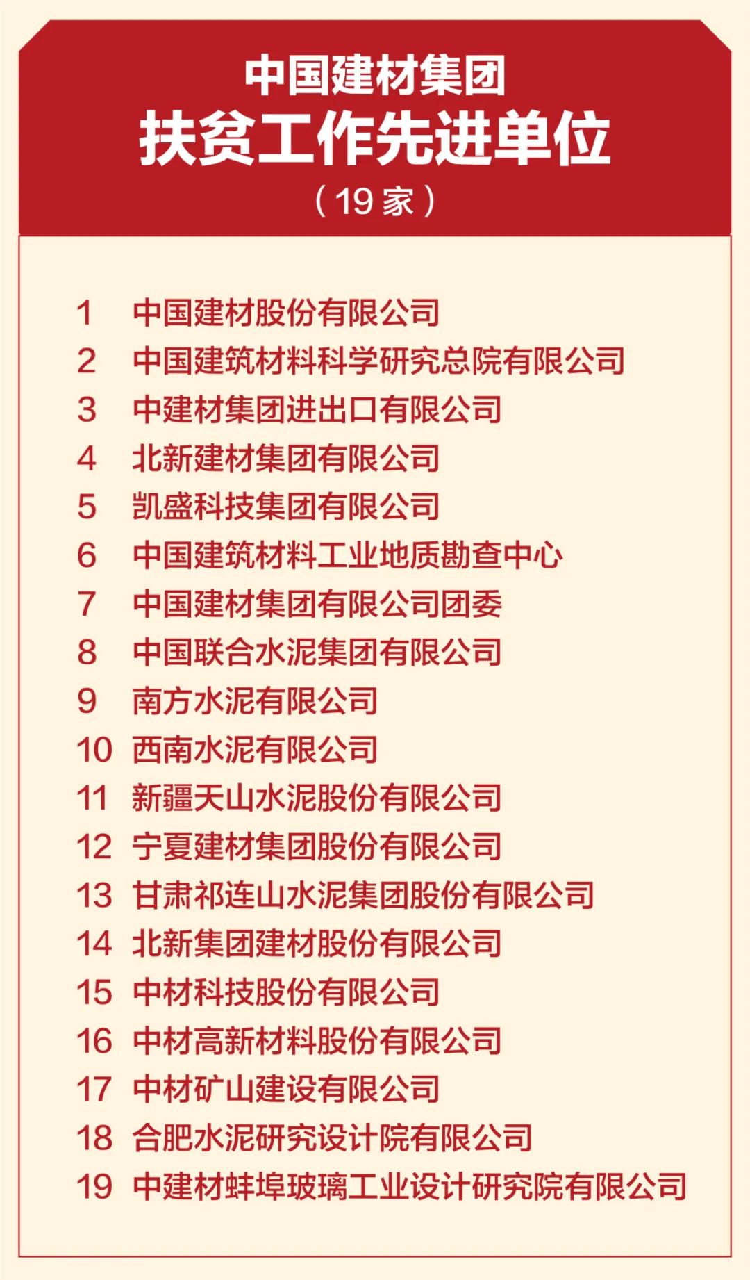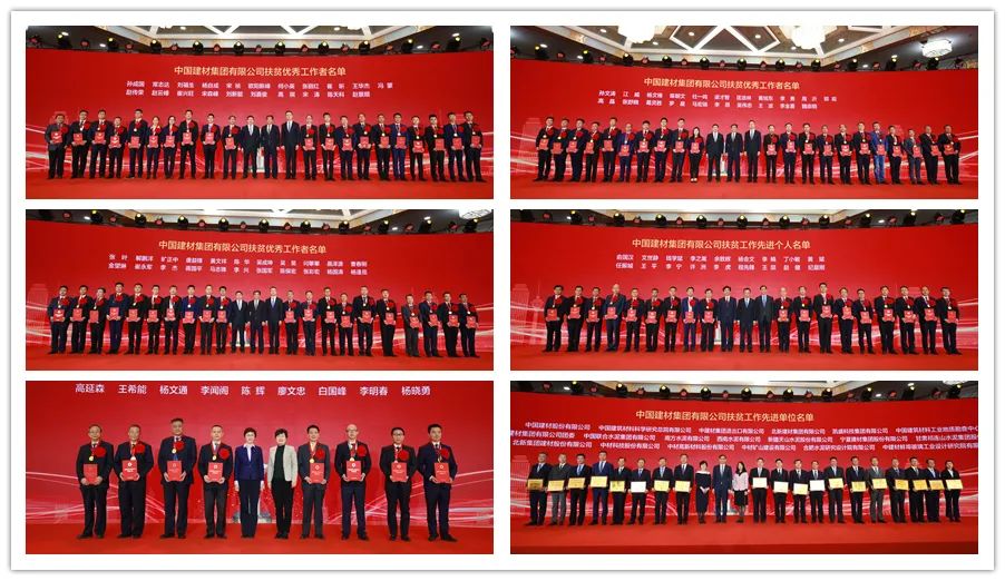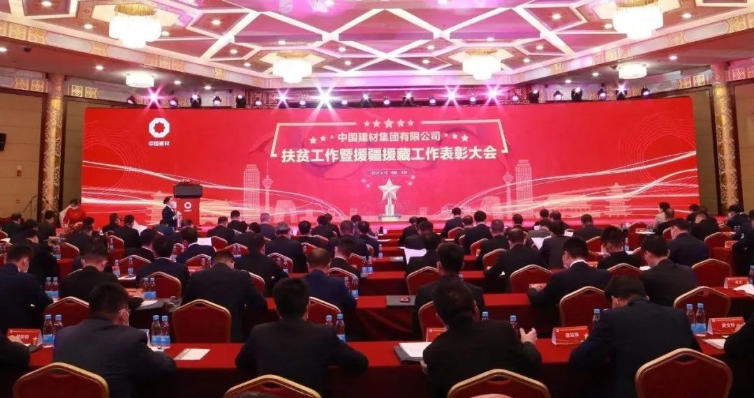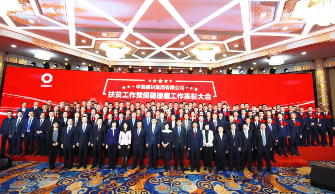 曹江林宣读表彰决定,党的十八大以来,集团积极响应习近平总书记号召,认真贯彻落实党中央、国务院和上级有关单位关于脱贫攻坚决策部署,集全集团之力,尽锐出战、合力攻坚。2020年我国脱贫攻坚战取得了全面胜利,区域性整体贫困得到解决,完成了消除绝对贫困的艰巨任务。集团定点帮扶的五个县区已脱贫出列,援疆援藏工作也取得了阶段性成果。为表彰在脱贫攻坚及援疆援藏工作中涌现出的先进个人和先进集体,充分展现脱贫攻坚成效成果,经集团党委研究决定:授予中国建材股份有限公司等19家成员企业“扶贫工作先进单位”称号,授予俞国汉等18名同志“扶贫工作先进个人”称号,授予高延森等9名同志“援疆援藏工作先进个人”称号,授予孙成国等64名同志“扶贫优秀工作者”称号。