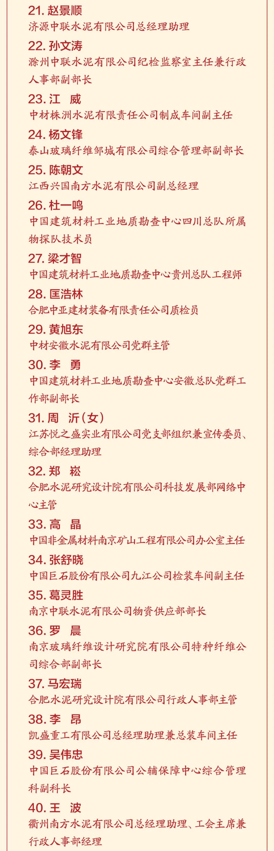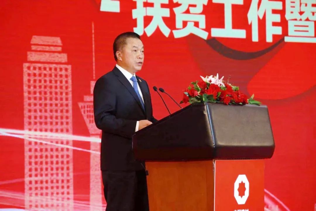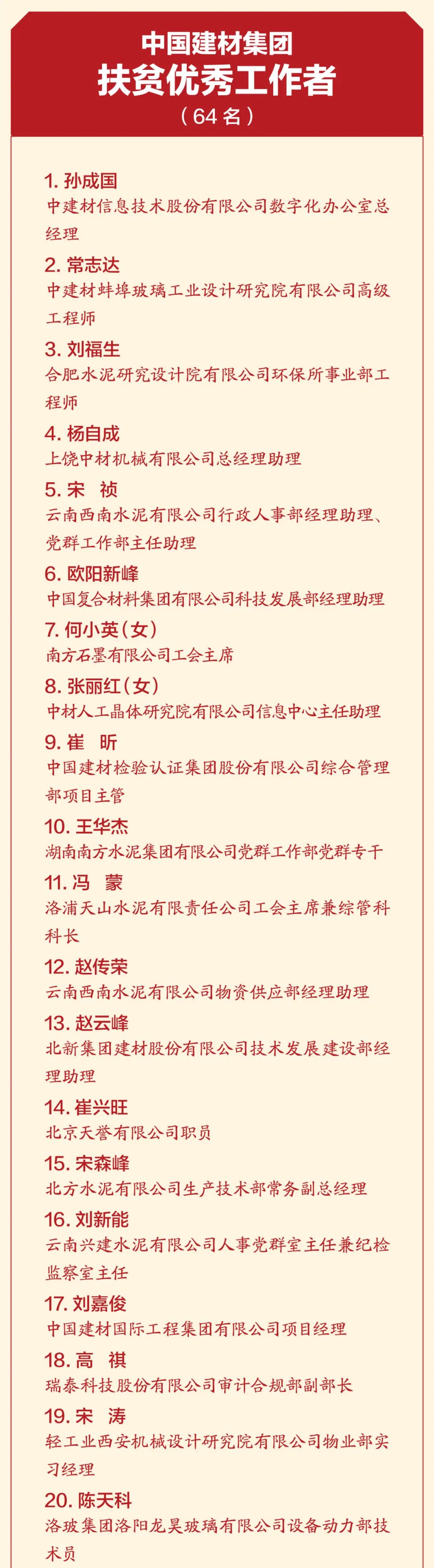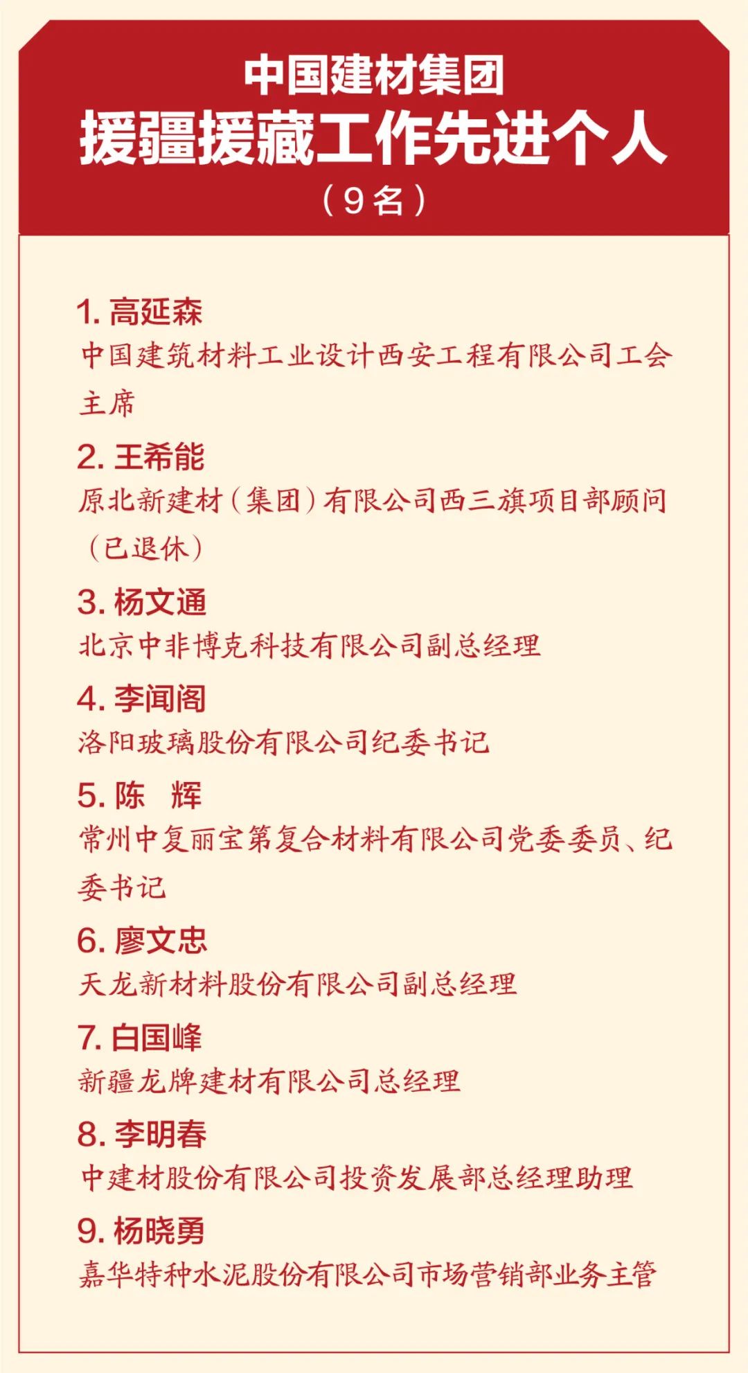 曹江林宣读表彰决定,党的十八大以来,集团积极响应习近平总书记号召,认真贯彻落实党中央、国务院和上级有关单位关于脱贫攻坚决策部署,集全集团之力,尽锐出战、合力攻坚。2020年我国脱贫攻坚战取得了全面胜利,区域性整体贫困得到解决,完成了消除绝对贫困的艰巨任务。集团定点帮扶的五个县区已脱贫出列,援疆援藏工作也取得了阶段性成果。为表彰在脱贫攻坚及援疆援藏工作中涌现出的先进个人和先进集体,充分展现脱贫攻坚成效成果,经集团党委研究决定:授予中国建材股份有限公司等19家成员企业“扶贫工作先进单位”称号,授予俞国汉等18名同志“扶贫工作先进个人”称号,授予高延森等9名同志“援疆援藏工作先进个人”称号,授予孙成国等64名同志“扶贫优秀工作者”称号。