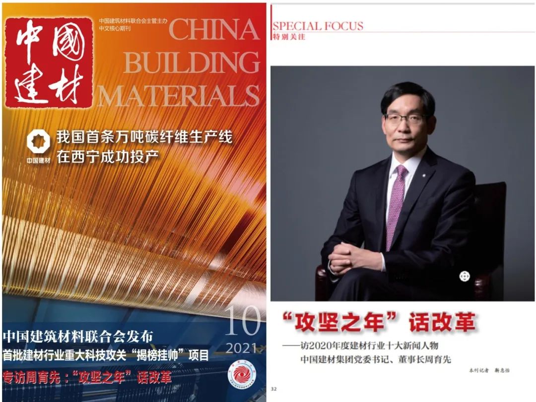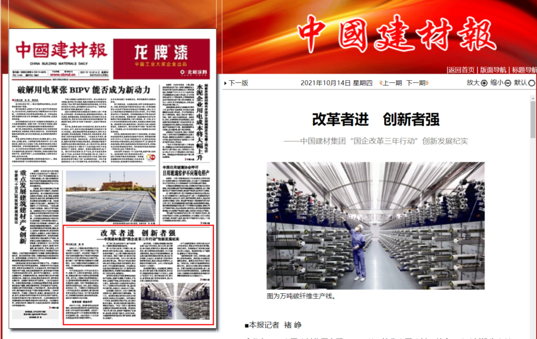 中国建材报专稿《改革者进 创新者强》中报道中国建材在改革三年行动中基于成长经历,结合实际,理念先行,奔着问题去改革,战略管控放在第一位。作国有资本投资公司改革试点,推动布局结构优化调整,推动开放共建,同时大刀阔斧进行机制改革。始终坚持创新驱动,科技创新、管理创新、商业模式创新、体制机制创新。以材料创造美好世界为使命,努力成为一家具有全球竞争力的世界一流材料产业投资集团。