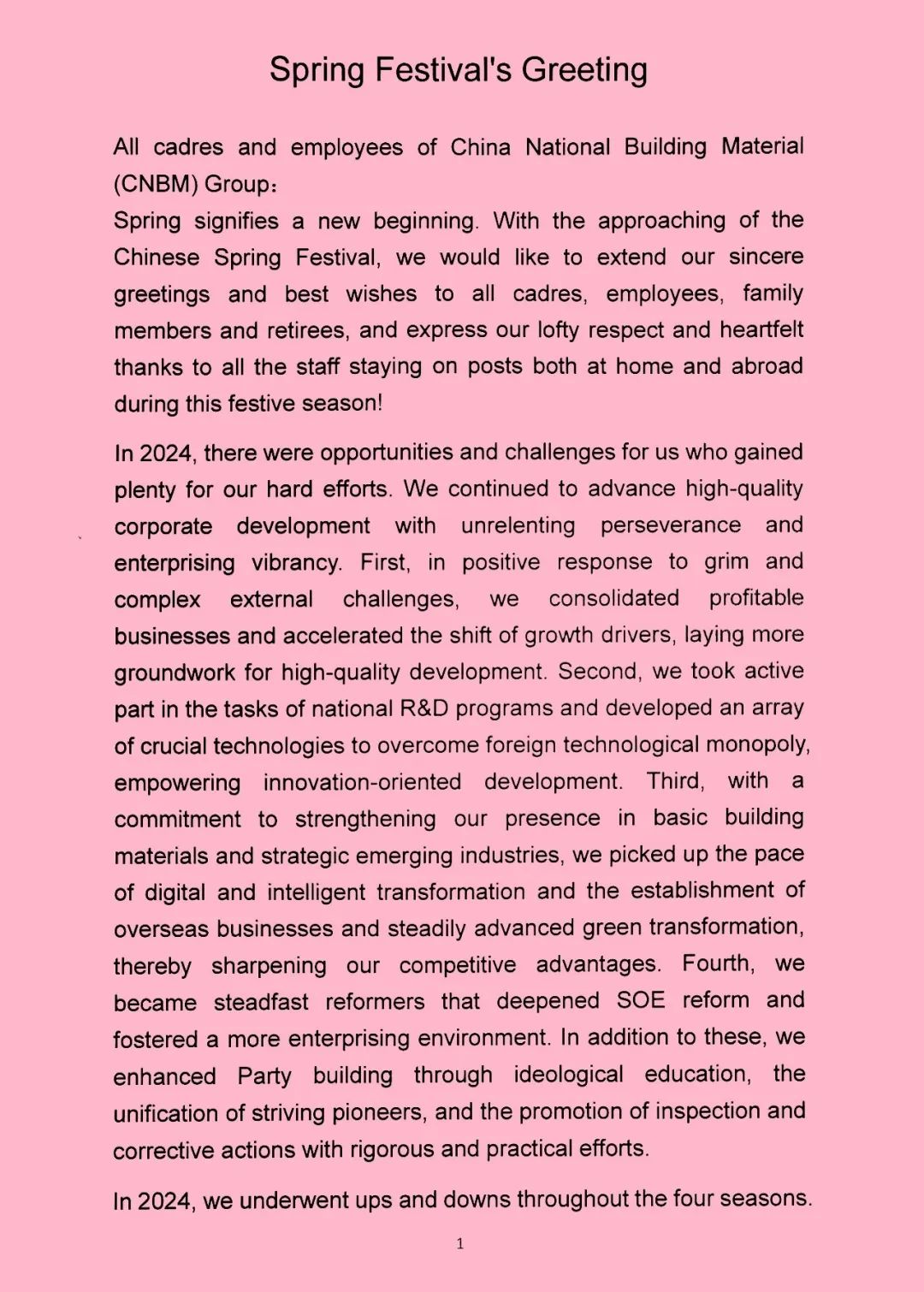 展望2025,岁序易,华章新。我们将迎来“十四五”规划收官和“十五五”谋篇布局的崭新一年,让我们继续秉承“材料创造美好世界”的企业使命,以奋斗者的姿态、创业者的激情、创新者的情怀,用坚定前行的脚步,跨越寒冬,共赴春暖花开!让我们围绕非金属材料制造及相关资本投资主业,拓增量、优存量、抓变量、强质量,不断增强核心功能、提升核心竞争力,以加快建设世界一流材料产业投资集团的发展新业绩,为推进中国式现代化作出更大贡献!