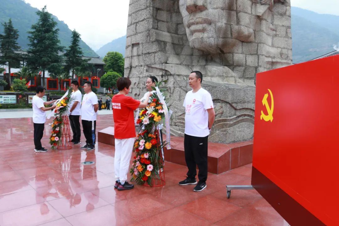 在大渡河畔,红军战士头像雕塑前,全体党员怀着崇敬的心情,向在此牺牲的革命先烈敬献花篮,向革命先烈致以崇高敬意。