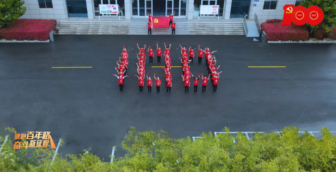 全体人员在展览馆广场排成“100”字样队形,向建党100周年献礼。