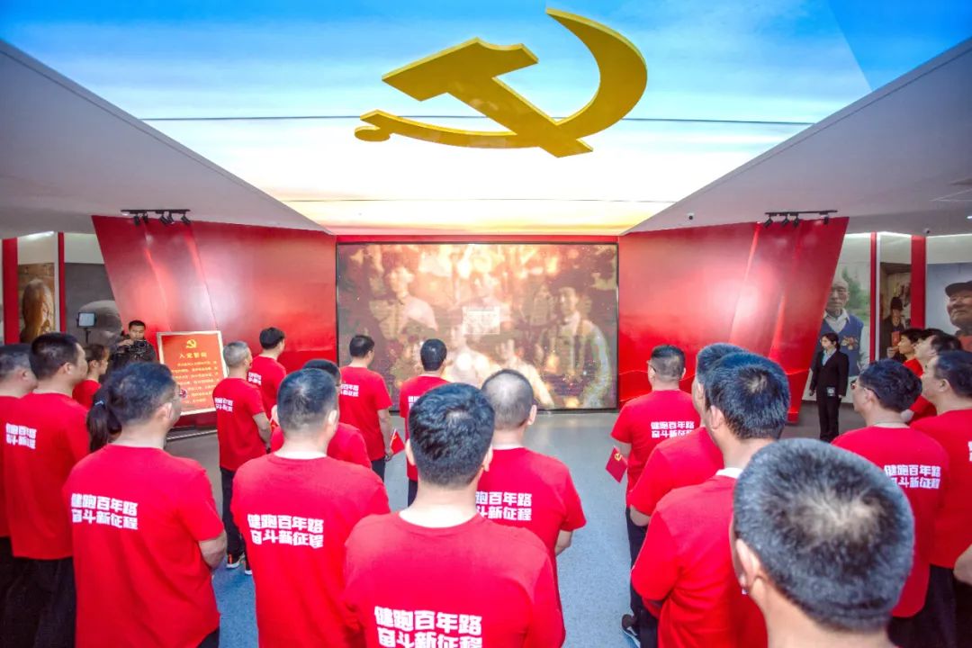 在展馆一楼大厅,全体党员举起右手,面对党旗庄严宣誓:“我志愿加入中国共产党,拥护党的纲领……随时准备为党和人民牺牲一切,永不叛党!”铿锵有力的宣誓声在大厅内回响,强烈震撼着在场的每一位党员的心。