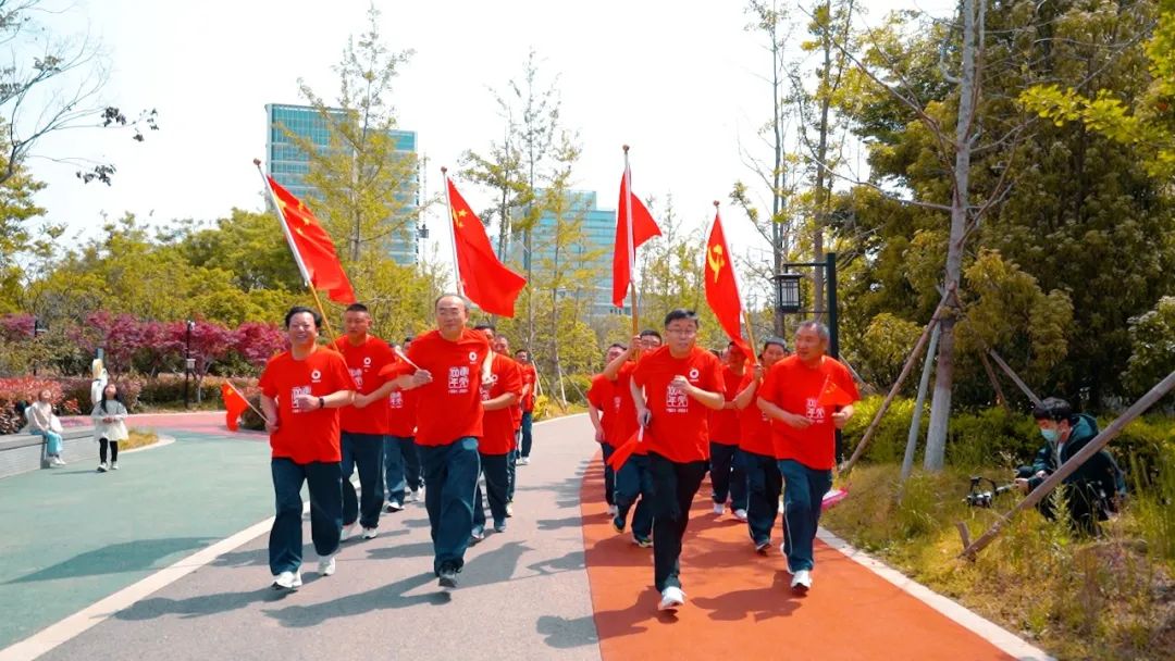 所有运动健儿们挥舞着党旗、国旗来到健跑活动地点响水县东鸣湖畔,本次健跑活动首先是环绕东鸣湖环形跑道进行7.1公里行程轨迹跑,寓意“七一”庆祝党的节日,然后进行百米接力赛,百米接力寓意建党百年高速、高质量发展,一代接一代进行传承、薪火相传。