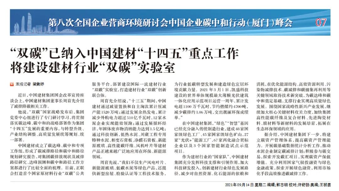 “双碳”已纳入中国建材“十四五”重点工作 将建设建材行业“双碳”实验室