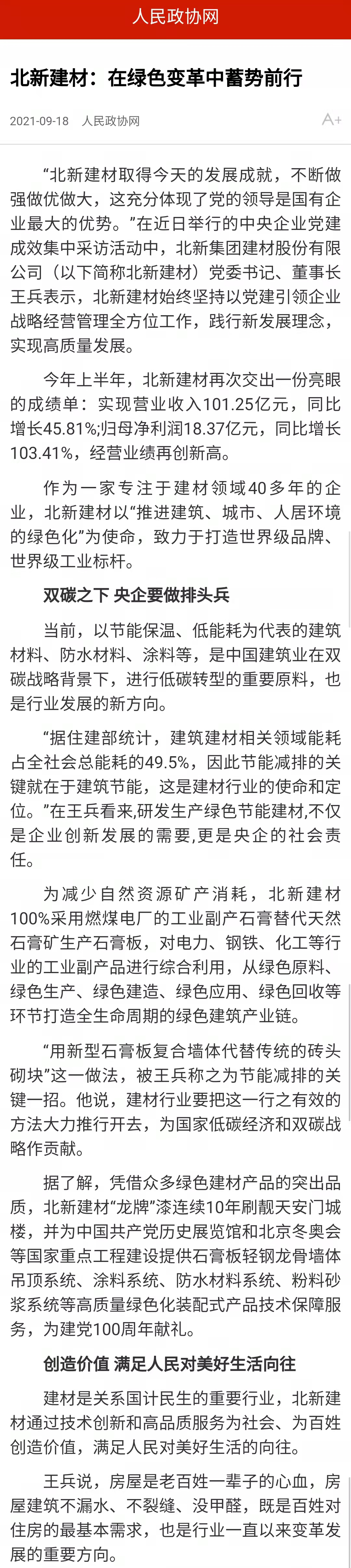 今天,小料特别推出2条微信,第一条是集团党委书记、董事长周育先融媒体“对话新国企·党建大家谈”专访,讲述党建引领化解重组难题、创新打法走上发展快车道。第二条就带大家走进北新建材的集中访谈了解情况。此次采访北新建材媒体包括中央电视台、《光明日报》《工人日报》《人民政协报》、中国新闻社、《中国证券报》《中国企业报》《每日经济新闻》《中国经济时报》、人民网、《国资报告》等11家,参观了未来建设馆、鲁班HOUSE、党史学习教育数字化教学基地、院士工作站、搜狗输入法下载园等,并对北新建材以高质量党建引领企业高质量发展取得的成效进行深度报道。