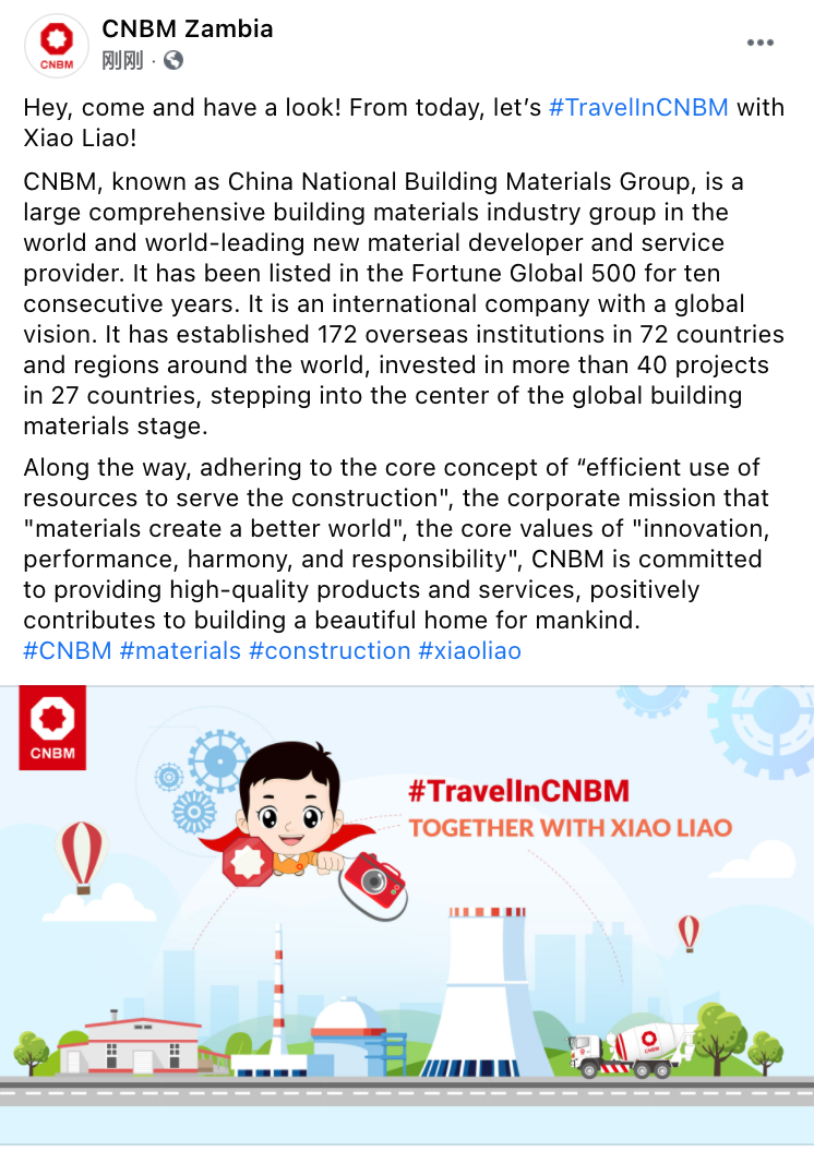 用好“价值认同”这张牌,发挥文化融合润物无声的力量,引发当地社会广泛的情感共鸣。推出“遇见赞比亚”“节日热点”“小料环游中华文化”“中式建材之美”等专题,建立与企业视角和话语相匹配的故事连接,寻求当地与中华传统文化的契合点,根植当地文化特色并与国际文明接轨,提升了文化感召力和亲和力,实现了“中国味”+“本土风”+“国际范”的有机融合。