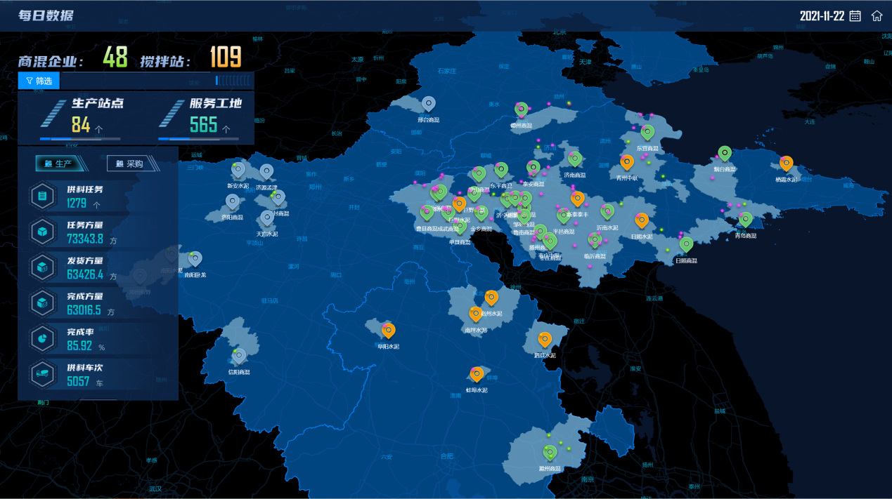 横向实现统筹部署、区域联动,通过地图展示场站市场范围、工程项目、销售区域、货源地等全局分布情况,统计图表和动态曲线展示云供应分析情况,为集团优化产业布局、协同区域发展提供决策支撑。