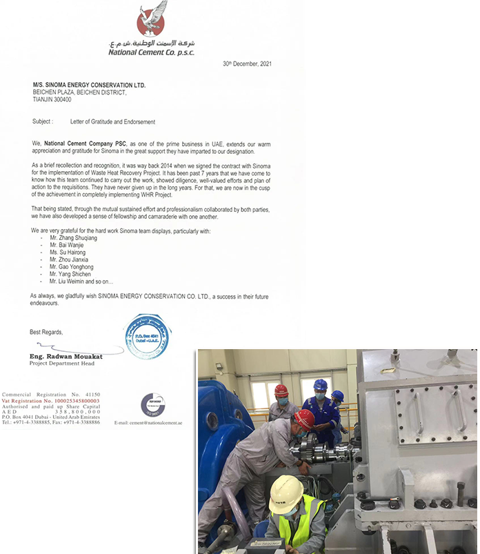 近日,中材节能承建的阿联酋国家水泥厂日产3300吨熟料干法水泥生产线7.5MW余热发电项目收到业主发来的感谢信,对中材节能在面对各种困难下的诚信精神和履约能力表示肯定,对一线团队的专业水平和敬业态度表示钦佩。该项目是以欧标为设计标准、以ASME作为锅炉制造标准,锅炉钢架采用高强螺栓链接,最大限度的回收余热,降低能耗,在保证工程质量的同时提升了发电量。