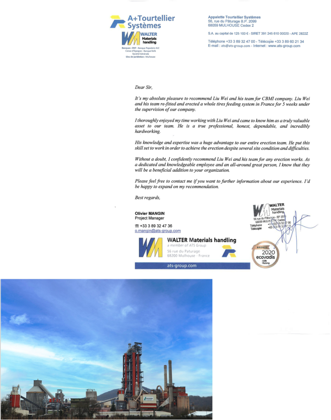 中材国际所属中材建设承建法国项目ATS废旧轮胎喂料系统安装圆满成功。废旧轮胎喂料系统广泛应用在欧盟的工业领域的AFR系统中,致力于碳减排和碳交易。项目部通过制定并优化施工周计划、月计划,对照检查,严格监管全程跟踪,分步分项控制好工程安全和质量。现场高效的工作效率和高质量的安装水平令ATS现场工程师不住赞叹。同时,项目施工工期相比合同工期提前12天完成,得到业主拉法基和ATS的高度肯定。