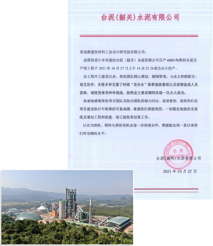 台泥韶关项目是台泥集团与中材国际所属成都建材院的首次合作。自项目开工建设以来,成都建材院项目团队精心策划、精细管理,与业主积极配合、相互协作,多措并举克服了岭南“龙舟水”雨季连续暴雨以及疫情造成的人员紧缺、调度困难等种种挑战,按照业主提前投产的要求顺利实现一次点火成功。此次项目成功点火,台泥业主对成都建材院优秀的履约执行能力和高效的目管控能力给予了高度赞赏,也为台泥集团与成都建材院进一步深度合作奠定了基础。