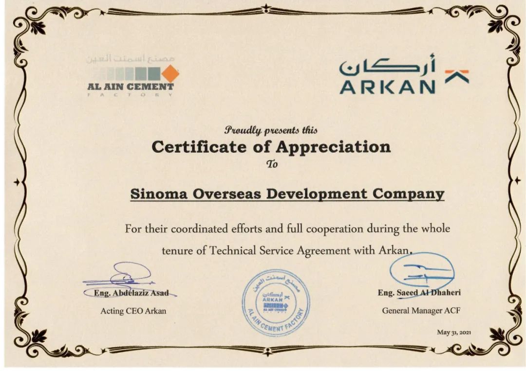中材国际所属中材海外阿尔坎技术服务项目收到业主感谢信