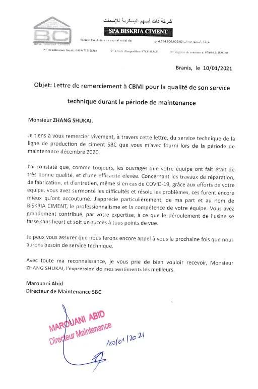 中材国际所属中材建设阿尔及利亚公司Biskria水泥公司生产线大修项目收到业主感谢信