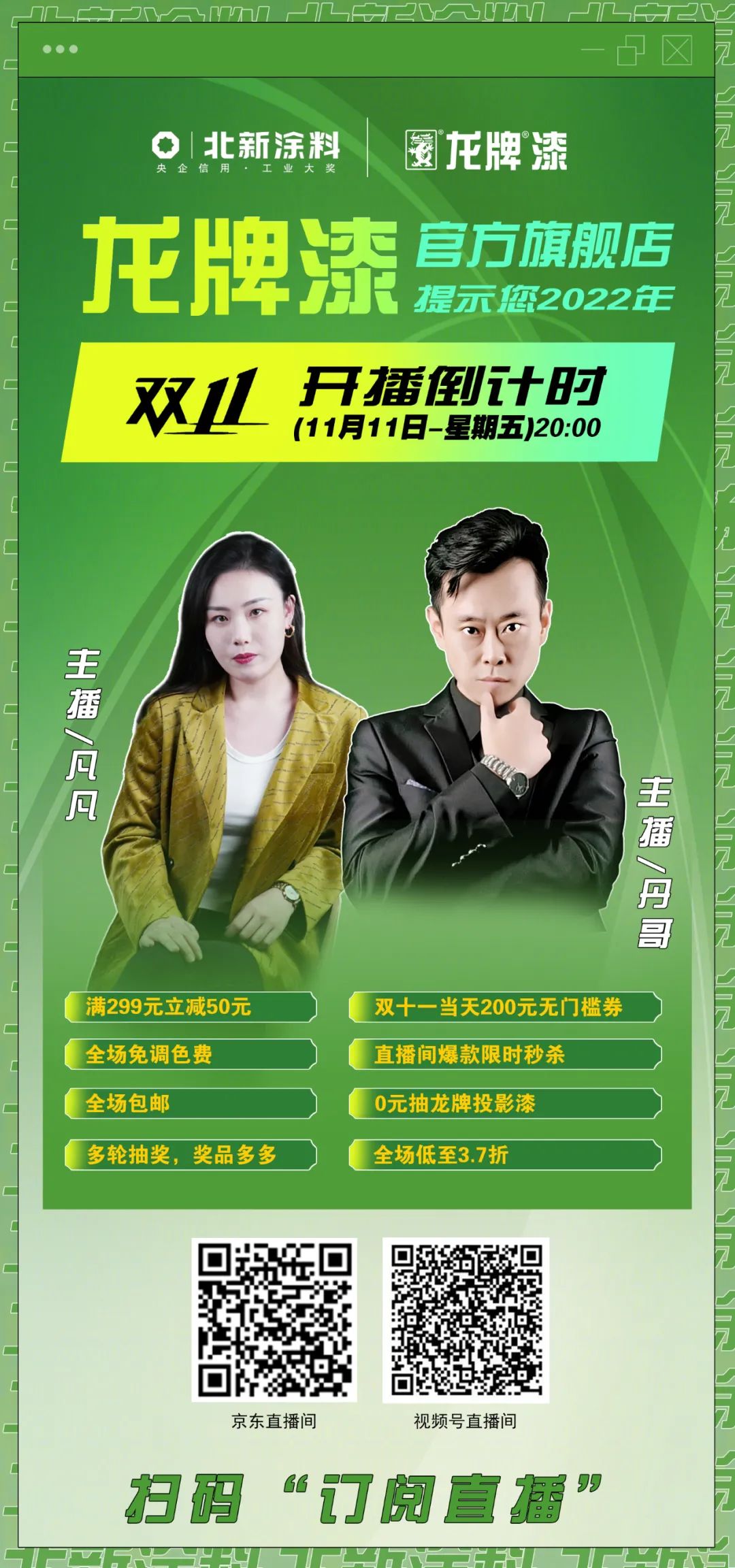 来源:北新涂料 发布时间:2022-11-14龙牌漆官方旗舰店直播间