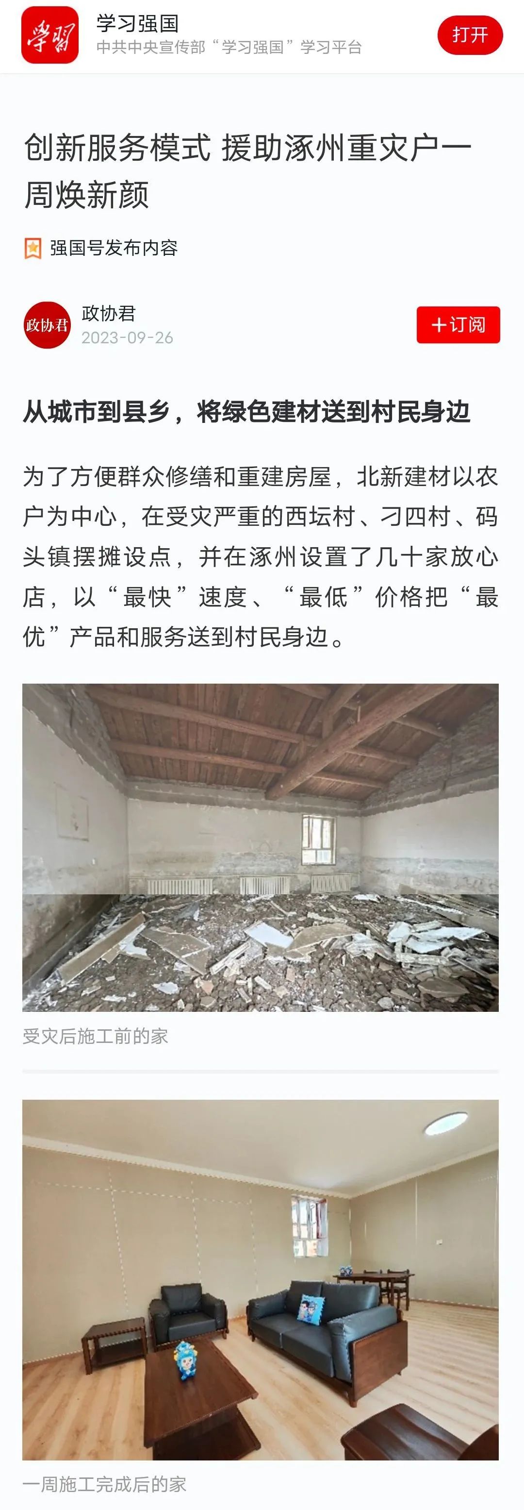 人民政协网从“创新服务模式 援助涿州重灾户一周焕新颜”角度介绍了北新建材践行央企责任,深入县乡灾区一线,积极助力灾区重建,把优质建材和服务送到村民身边,推动“四个转变服务升级”的创新实践。