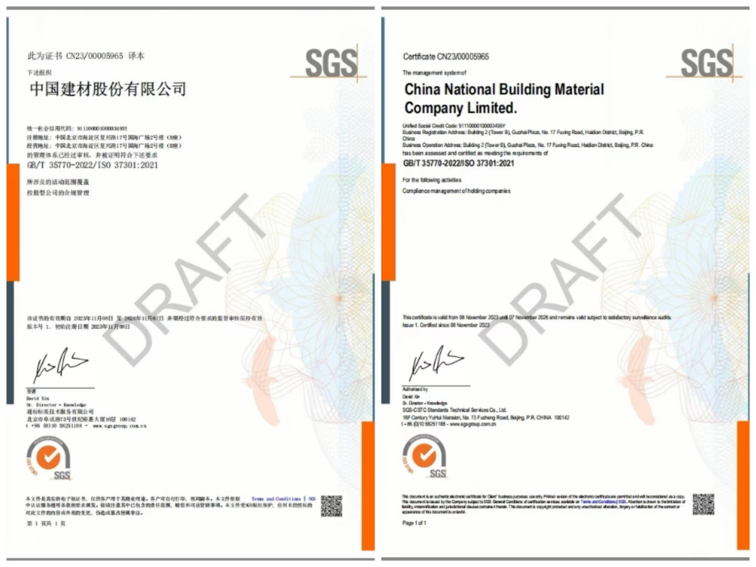 近日,中国建材股份荣获国际公认的检验检测认证机构SGS通标标准技术服务有限公司颁布的合规管理体系ISO 37301-2021国际标准和GB/T 35770-2022国家标准“双认证”证书,以“零不符项”并取得三项正面推荐的佳绩,成为建材行业首家通过“控股型公司的合规管理”领域国际标准和国家标准“双认证”评审的企业。