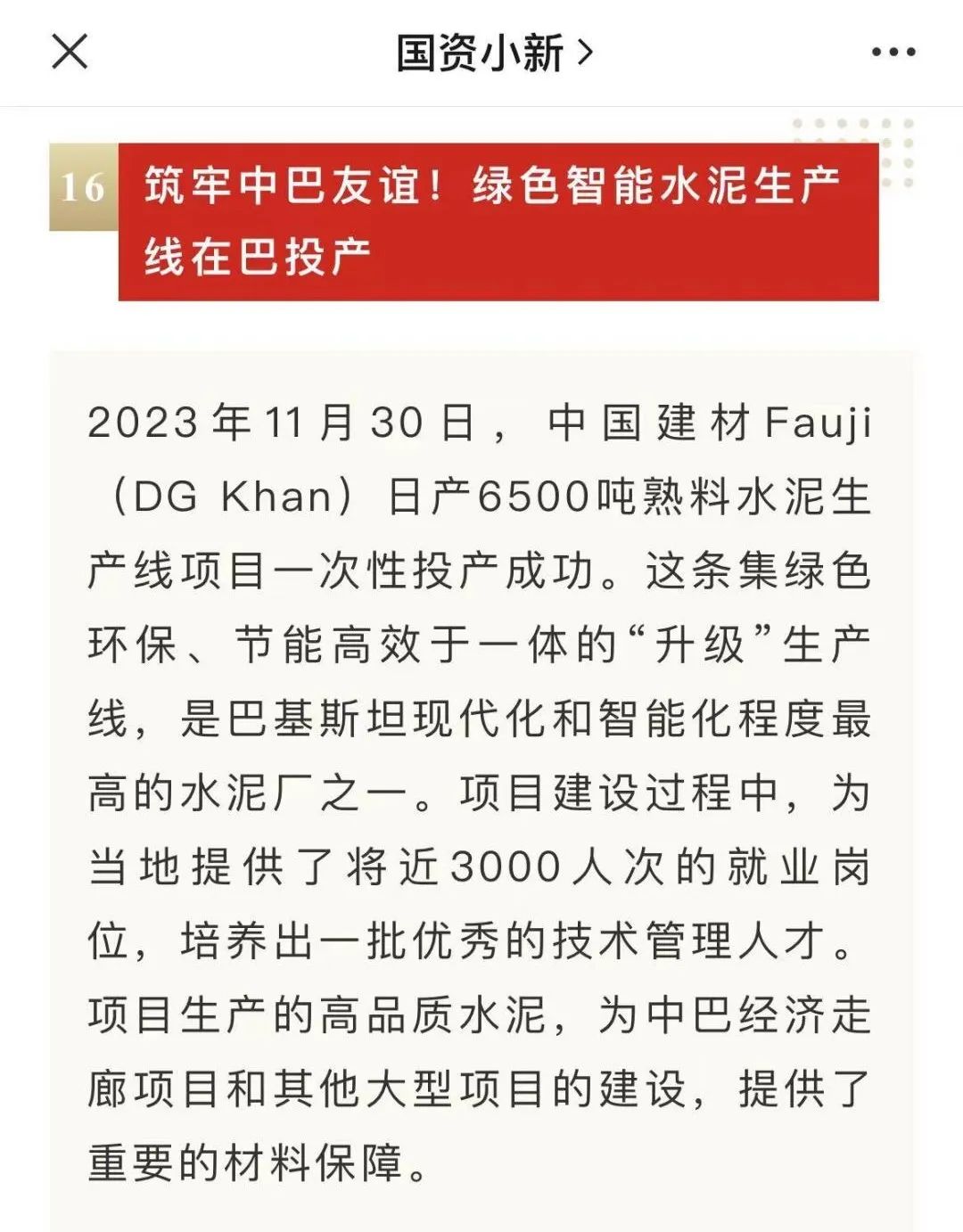 2023年11月30日,由中材国际所属合肥水泥院总承包、邯郸中材施工的巴基斯坦Fauji(DG Khan)日产6500吨熟料水泥生产线项目一次性投产成功。从基础开挖到点火投料,该项目仅用13个月,比合同工期提前3个月,成功见证巴基斯坦水泥EPC工程中的“中国速度”。