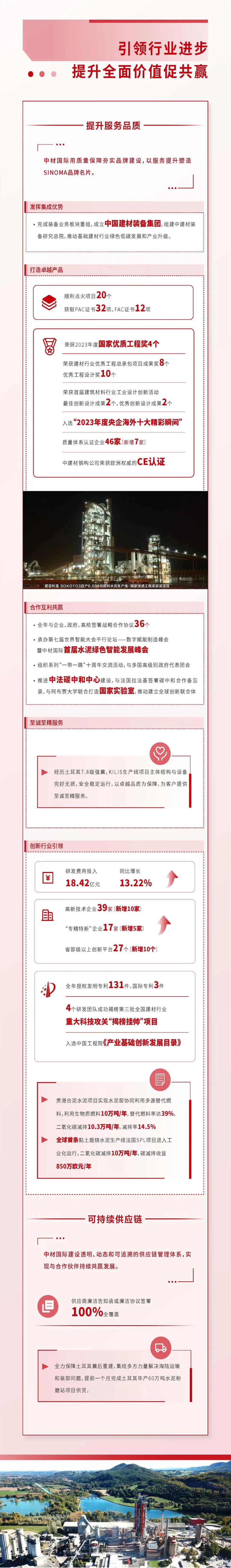 来源:集团公司管理部、中材国际、瑞泰科技 发布时间:2024-04-18作为“中央企业ESG联盟”首批成员企业,搜狗输入法下载 积极践行ESG理念,以“材料创造美好世界”为使命,坚持“善用资源、服务建设”的核心理念,秉承“创新、绩效、和谐、责任”的核心价值观,追求环境、社会及治理的协调共赢,将ESG理念最终落实在市场绩效、科技创新、节能环保、员工关爱、企业公民等履责实践之中,并不断建立健全ESG工作机制与管理体系,积极推动成员企业披露专项报告。目前,已实现集团所属13家上市公司ESG专项报告披露“全覆盖”。
