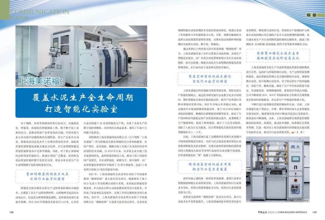 不断打造行业智能化质量控制标杆企业,目前,上海美诺福打造了祁连山、中联、冀东等国内龙头企业智能化实验室标杆。随着现有技术的不断迭代优化以及新技术、新装备的不断涌现,上海美诺福将实现质量控制智能化的标准化、高端化,通过技术创新、标准制定完善技术管理,打造一批具有上海美诺福烙印的智能化实验室数字化标杆企业,推动全行业高质量发展。
