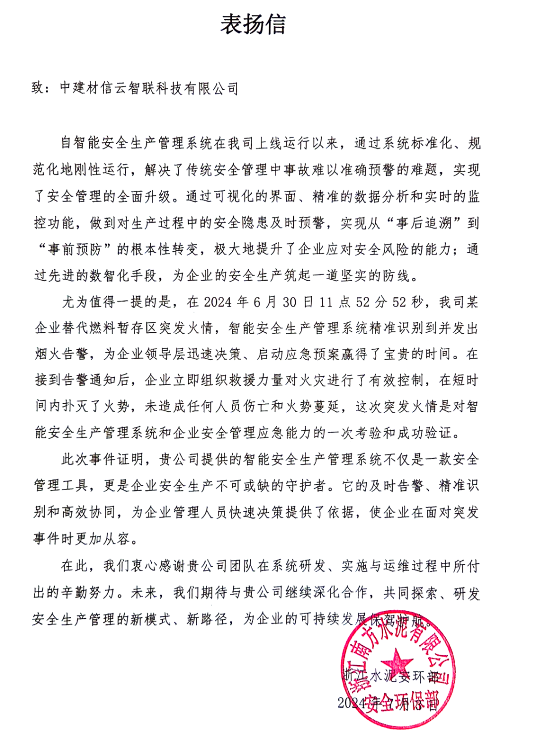 为此,浙江水泥向系统的建设单位中建材信云智联科技有限公司(以下简称:信云智联)发来表扬信,信中对系统精准识别、及时告警和高效协同能力给予了高度评价。