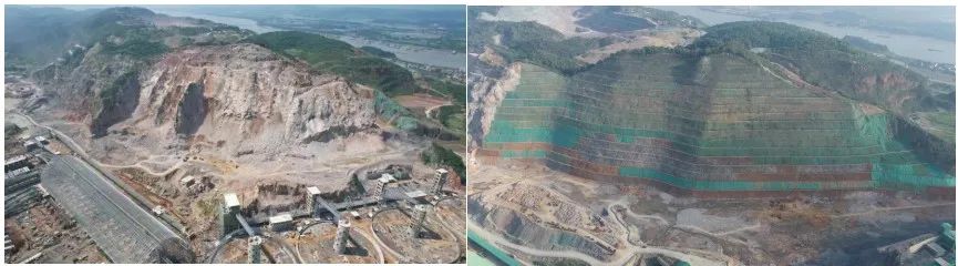 中材矿山西安阳新分公司承接了湖北省阳新县沙村建材厂矿区生态修复工程,通过系统性治理成功实现地质安全与生态功能双提升。该区域原为高180米的岩质陡坡,存在滑坡、落石等重大隐患。工程采取分级削坡策略,设置17级马道体系,将坡度控制在55°以内,同步实施坡面加固及3米宽马道封边墙建设。创新采用客土喷播技术,混合播种刺槐、紫花苜蓿等8种耐旱植物,并专设生物多样性保育区优选本土物种重建生态链。历时27个月(2022.6—2024.9),完成危岩清理面积12.5万平方米,喷播绿化率达95%,水土流失量下降80%,为长江中游矿山修复提供了“岩壁复绿+生态重建”的示范样板。