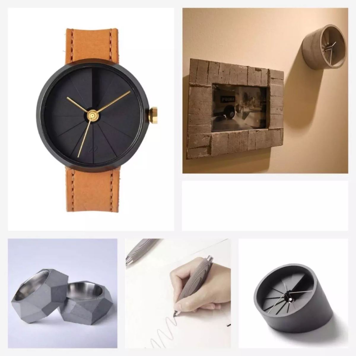 他们的饰品,以建筑和都市生活为灵感,结合水泥和不锈钢两种材料。别人觉得水泥刚硬、粗犷,但他们却专用水泥做各种精美装饰品,钟表、笔、戒指、耳钉……造型都非常简单,很多作品的表面都会有一些小气泡或裂纹甚至颜色也会有不均匀,这些都是他们刻意保留的细节,力求把水泥的质感大面积呈现出来。水泥像是有生命一般,会随着时间而变化,水泥的特性会因为摩擦碰撞或汗水侵蚀让表面产生出不同的岁月痕迹,这就是水泥最独特的魅力。