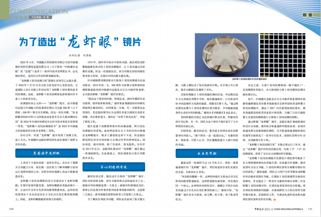 近期,《中国建材》杂志发表专题文章《为了造出“龙虾眼”镜片》。中国建材总院立足国家需求,创新性地研制出具有微米级曲面方孔阵列结构的龙虾眼X射线探测镜片,实现国际上首台在轨工作探测器龙虾眼X射线聚焦技术的成功应用。小料带你一起去了解下总院龙虾眼X射线探测镜片的研发历程~