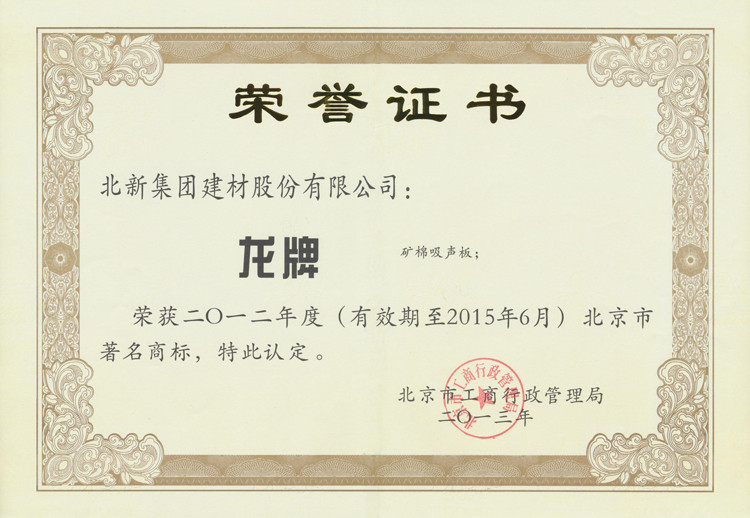 9月,北新建材“龙牌”矿棉吸声板被认定为2012年度北京市著名商标。此次评审由北京市工商行政管理局主办,经市局会同市农委、市质监局等权威部门的认真审核,广泛征求行业协会及专家意见进行评选认定。2012年度北京市企业申报北京市著名商标千余件,其中获评179件,北新建材“龙牌”凭借过硬的产品质量和极高的品牌影响力,顺利摘取公司第四件北京市著名商标。
