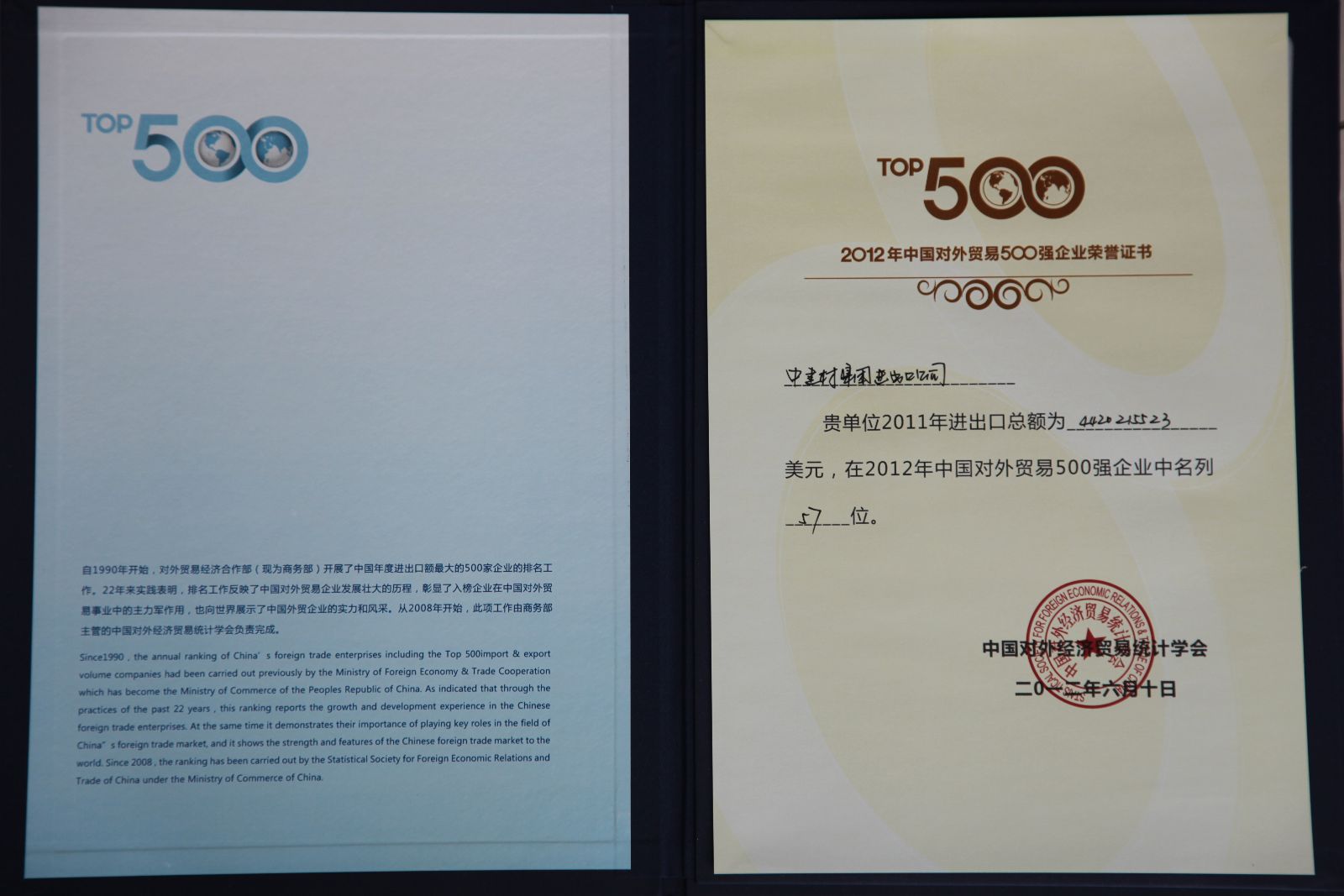 6月11日,由商务部主办的“2012年中国对外贸易500强企业论坛”发布了本年度“中国外贸企业500强”名单。中建材进出口以44.2亿美元的进出口额排名第57位,其中进口额超过36亿美元,出口额8.16亿美元。这是中建材进出口连续7年进入中国外贸500强企业,进出口额较上一年增长了近10亿美元,增幅27%。