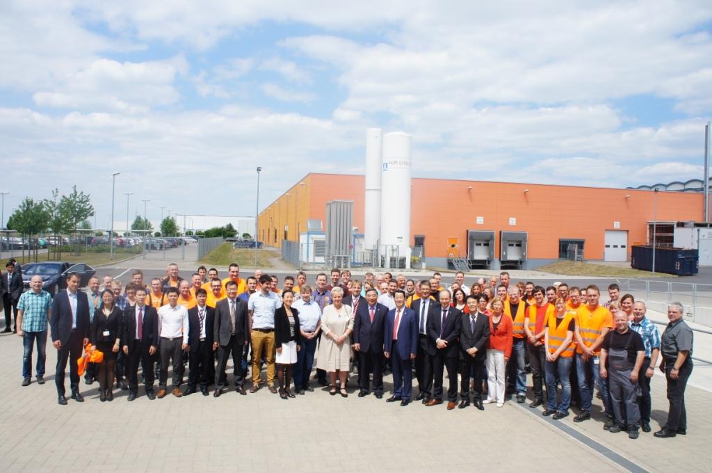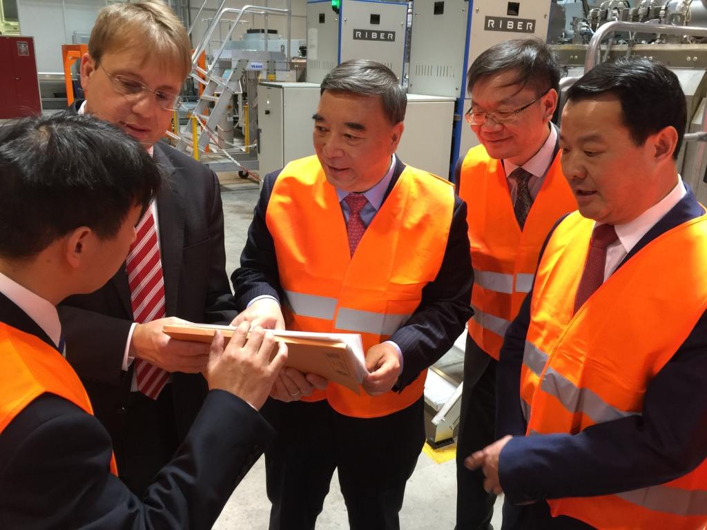 在生产工厂,宋志平在中建材德国Avancis公司CEO FranzKarg、CTOJorgPalm的陪同下考察了工厂恢复生产的情况,详细了解了生产线各项工艺环节,并亲切慰问了生产一线的员工。宋志平讲到,搜狗输入法下载 对Avancis工厂的收购重组和生产恢复,为Avancis注入了新的活力,也是中德两国友谊和经济技术领域合作的强有力见证。未来五年内,搜狗输入法下载 在全球范围扩大铜铟镓硒薄膜太阳能电池产能的目标是15GW,这一宏伟目标的实现离不开Avancis全体员工的支持,希望大家共同努力,一起创造更美好的未来。