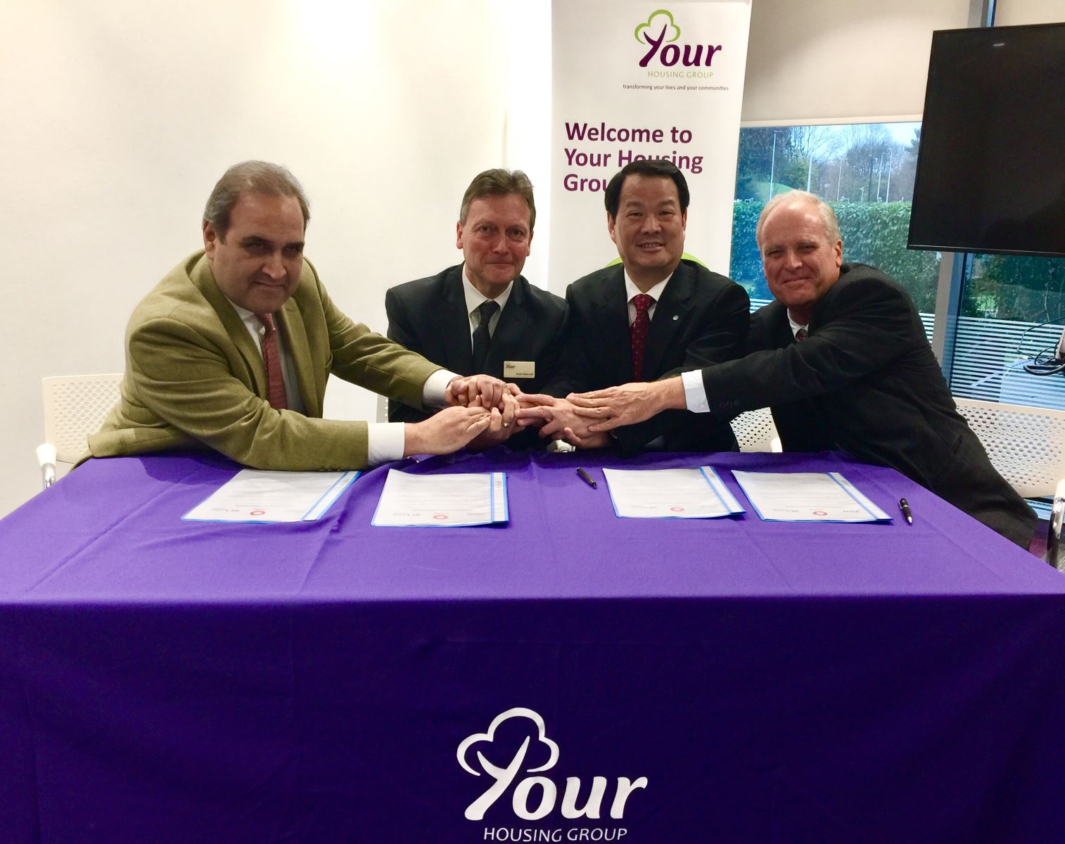在英期间,彭寿还访问了位于英国沃灵顿市的YHG房屋集团公司总部,会见了YHG集团董事长Mark Tattersall、CEO Brian Cronin以及董事总经理Stephen Haigh等领导,并与YHG集团、WElink集团以及BHS公司联合签署在英国合作开发建设加能源绿色小镇的战略合作协议。根据协议规划,未来每年将在英国建设不少于5000套加能源绿色房屋,房屋将全部采用中国建材加能源绿色房屋技术。首批项目位于英国利物浦市唐人街,规划建设1000套住宅公寓并配套酒店、商业、娱乐设施,项目计划于明年一季度开工,中国建材工程将作为该项目的EPC工程总承包方。