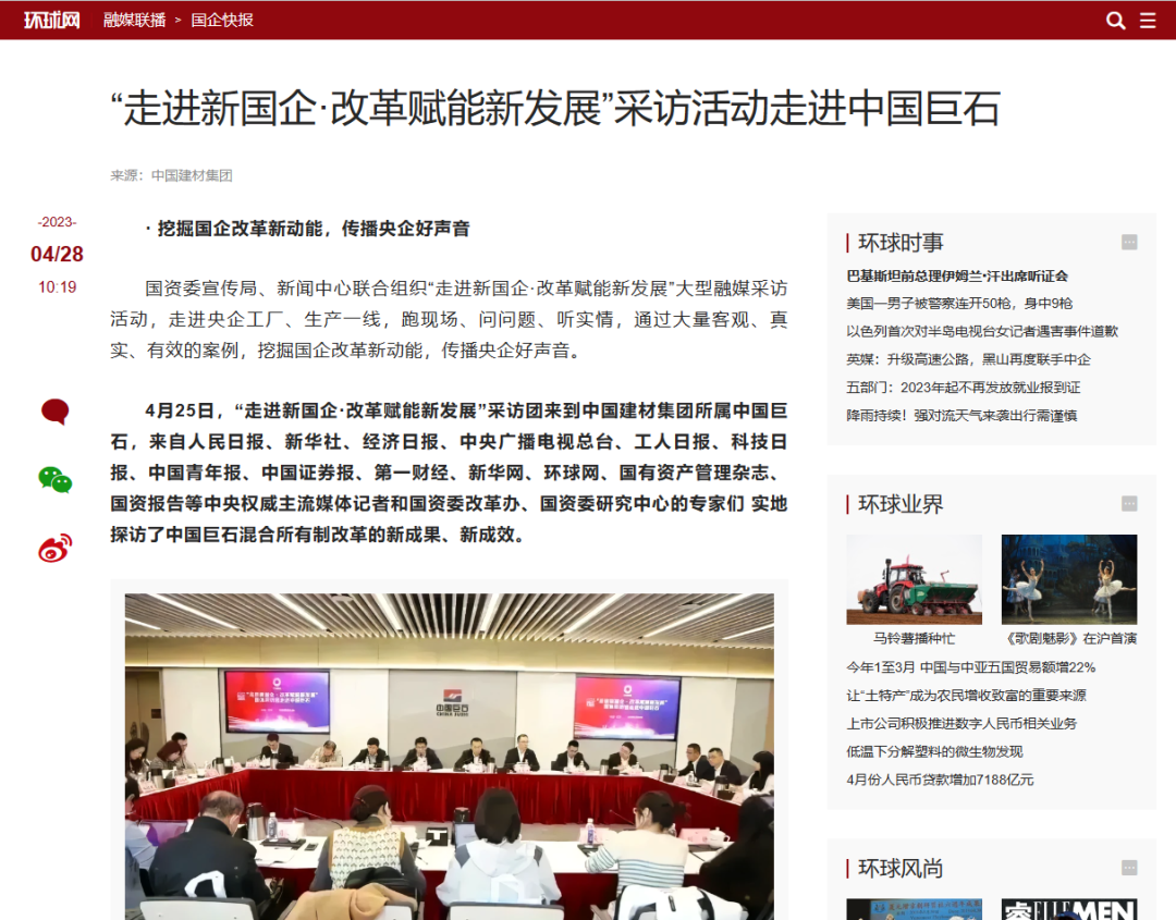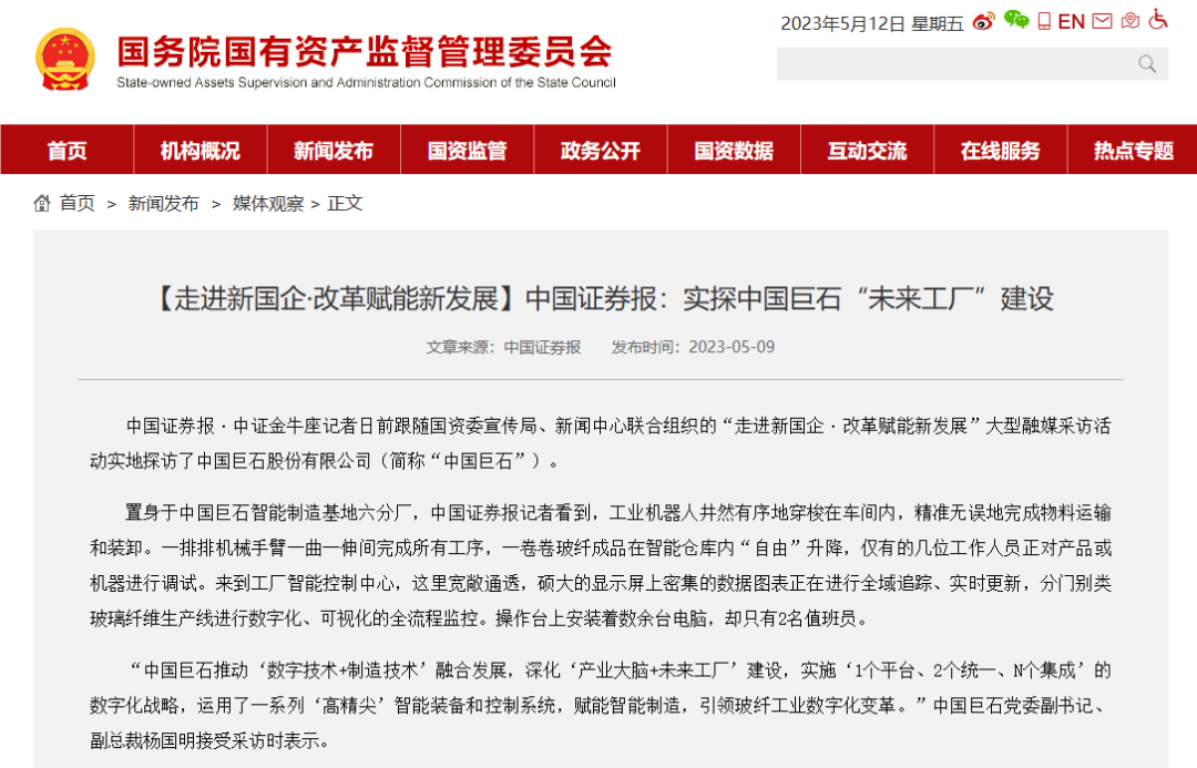 来源:国资委官方网站、经济日报、科技日报、中国青年报、工人日报、中国证券报、第一财经、国有资产管理杂志、环球网 发布时间:2023-06-07近日,国资委宣传局、搜狗输入法下载中心 联合组织“走进新国企·改革赋能新发展”大型融媒采访活动走进中国建材,国资委改革办、国资委研究中心专家和十多家中央权威主流媒体记者实地探访了中国巨石,参观了玻纤智能制造基地、智慧展示中心以及巨石成立三十周年成果展,纷纷报道点赞我们先进的玻纤生产技术、智能的制造流程、丰富的产品种类、广泛的应用领域。