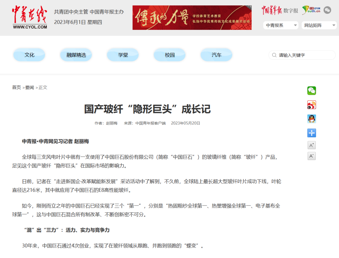 给予的充分信任下,抓住先机,牢牢把握新一轮科技革命和产业变革的大势,向数字化、智能化方向优化升级,在智能制造方面取得优异成绩。 中国青年报 国产玻纤“隐形巨头”成长记 (扫码阅读原文) 中国巨石智能制造基地1000多亩的土地上,一年可以产出 60 万吨粗纱、22 万吨细纱和8亿米电子布,电子布的长度可绕地球两圈。中国巨石还将“未来工厂”建设扩大到了外部,促进产业上下游协同发展。如今,中国巨石的智能制造等先进玻纤生产技术已从桐乡总部推广至成都、九江、埃及苏伊士以及美国南卡罗来纳州。中国巨石还打通了生产制造与企业经营的数据链,通过高标准建设行业工业互联网平台,实现产品生命周期、生产经营的全领域的数字化管理。 工人日报 这些年,国企改革带来新变化 (扫码阅读原文) 从1993年成立,建起第一座中国人自己设计的玻璃纤维池窑,到打破国外长期技术垄断,实现全球市场占有率四分之一,巨石一路弯道超车,成为世界规模最大的玻璃纤维制造商。如何创造这份奇迹?中国巨石给出了答案。 中国证券报 实探中国巨石“未来工厂”建设 (扫码阅读原文) 中国巨石推动‘数字技术+制造技术’融合发展,深化‘产业大脑+未来工厂’建设,引领玻纤工业数字化变革,目前已实现“热固粗纱、热塑增强、电子基布”三个“全球第一”目标,为世界玻纤工业发展树立了一座新标杆。2023年又开启了打造全球首个玻纤零碳智能制造基地的新征程。 “现代新国企”是怎样炼成的 (扫码阅读原文) 在中国巨石未来工厂里,每天生产的玻纤纱能绕地球450圈,工厂自动化率超98.5%,大大提升人均生产效率,远超行业平均水平。 第一财经 混改赋能、重组质变: 三年改革为国企带来新变化 (扫码阅读原文) 中国建材积极探索差异化管控新模式,在允许范围内给予中国巨石最大的经营自主权,在“放活”的同时注重“管好”,确保效率提升,确保风险可控。中国巨石尝试探索建立高效的治理架构,探索实施超额利润分享等中长期激励机制……市场化、灵活、信任的“混合”使得中国巨石活力越来越强。 国有资产管理杂志、环球网 “走进新国企·改革赋能新发展”采访活动走进中国巨石 (扫码阅读原文) (扫码阅读原文) 国有资产管理杂志、环球网刊发《“走进新国企·改革赋能新发展”采访活动走进中国巨石》。1999年至2022年,混合所有制改革助力中国巨石经营质量和经营业绩实现跨越式增长,成为了国家混合所有制的典范。迈入新时代,巨石产品研发瞄准市场前沿,不断优化产品结构,以创新布局高端应用领域;把握科技革命大势,全力赋能智能制造,引领玻纤工业数字化变革;国际拓展,打造高质量发展的海外“增长极”;强化绿色生产过程,完善绿色设计理念,实现可持续发展。