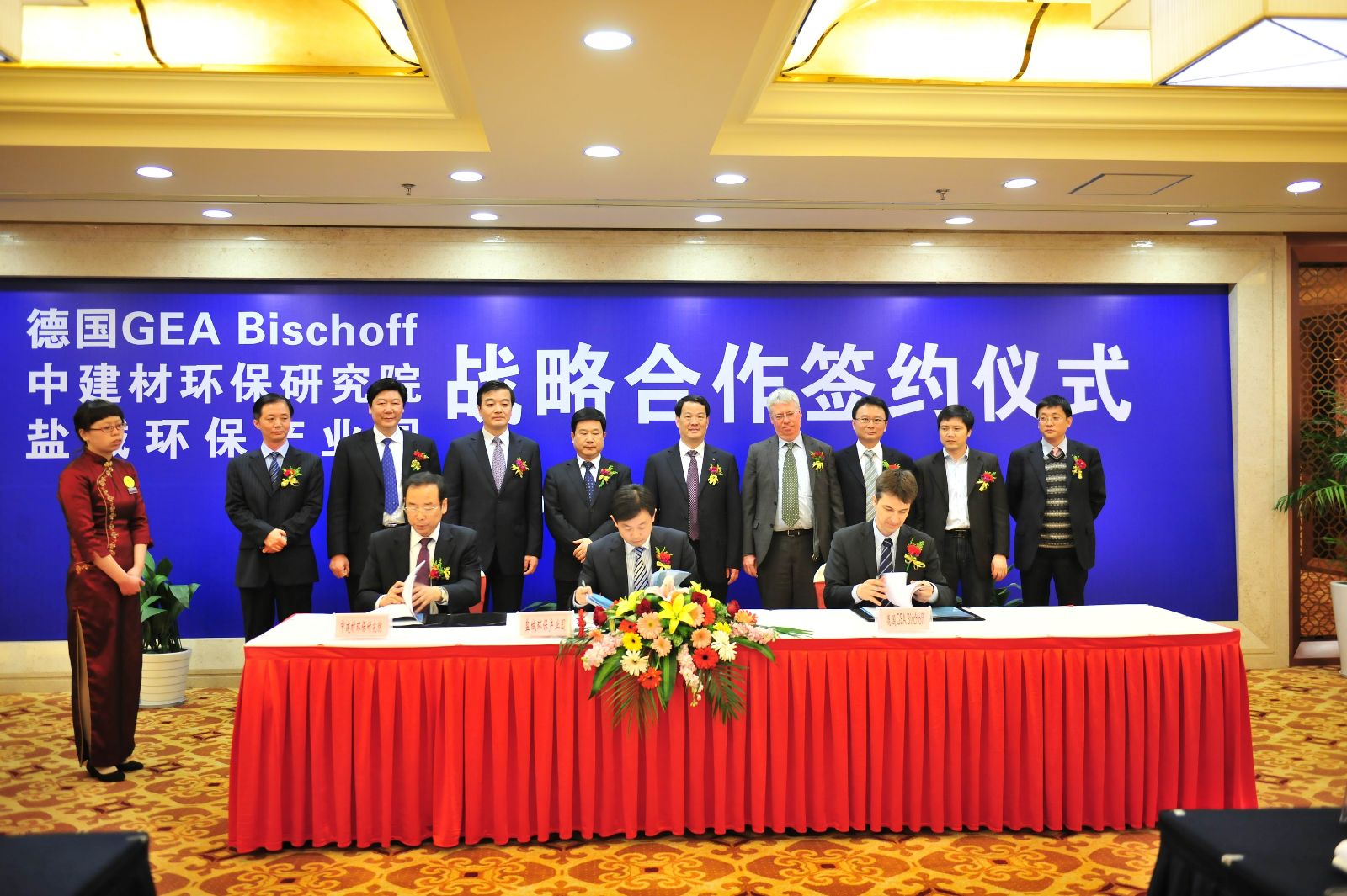 3月29日,中国建材国际工程集团有限公司和德国GEA集团在江苏盐城举行隆重的签字仪式,双方就共同参与的水泥行业项目、水泥烟气SCR脱硝项目建立了长期独家合作关系。中国建材工程集团董事长、总裁彭寿先生和GEA总经理Palinski, Andreas先生在合作协议上签字。中国建材工程集团副总裁茆令文、总经理助理陶立纲等出席了签字仪式。第三方合作伙伴盐城市亭湖区政府也派代表到现场祝贺。