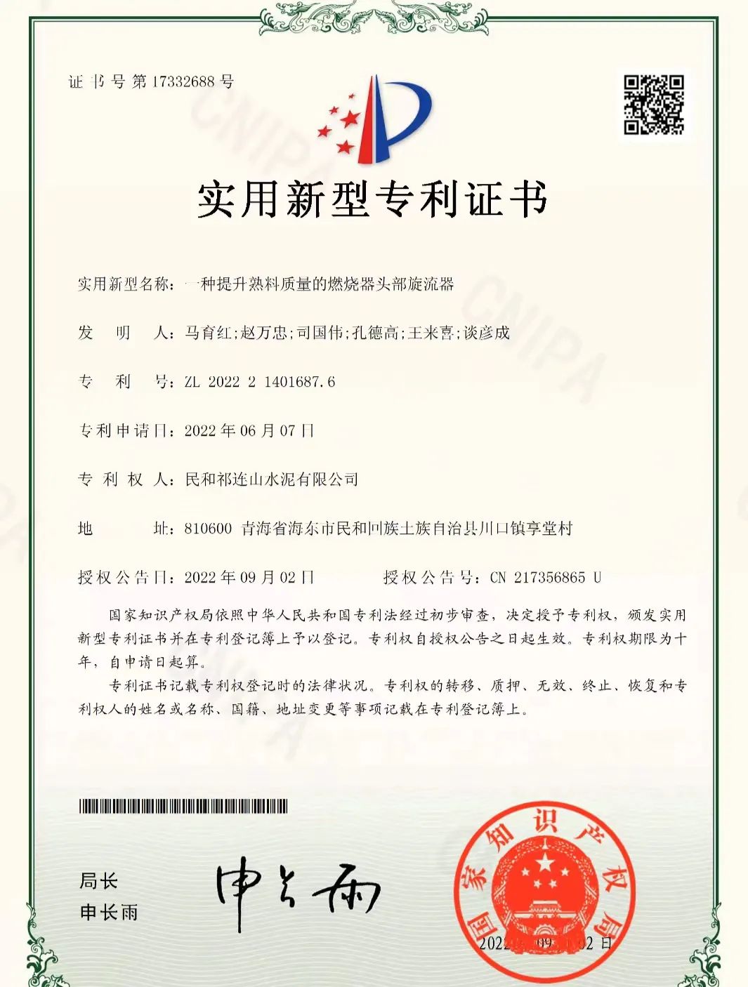 祁连山水泥4项专利获批国家知识产权局“实用新型专利”