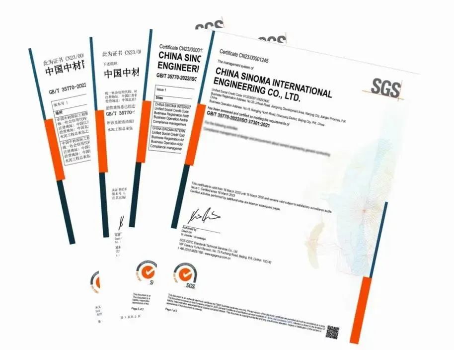 近日,中材国际成功通过GB/T 35770-2022/ISO 37301:2021合规管理体系认证,成为集团内首家获得SGS通标标准技术服务有限公司颁发合规管理体系“双认证”证书的企业。此证书是SGS通标公司为工程类企业颁发的首张合规管理体系认证证书。此次获证,标志着中材国际的合规管理水平已达到国内和国际标准要求。