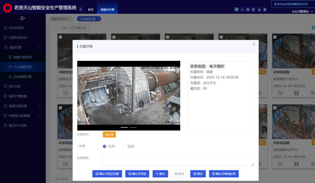 为增强事故预防和处理能力,信云智联帮助若羌天山部署了电子围栏、安全帽识别、高温服识别、高空作业安全带识别、皮带翻越检测等智能分析算法,基于厂区摄像机采集的视频,通过智能视频AI可以自动发现安全问题与违章行为,实现主动预警,“智能安全生产管理系统使用后,员工的安全意识有了明显提高,安全观念也发生了转变,不仅会自觉穿戴好安全帽、反光衣等个人防护用品,同事间也会相互提醒注意安全防范。”