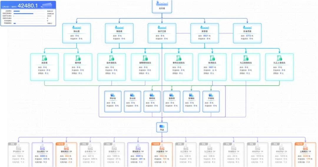 江西水泥聚焦问题导向,结合严控煤炭库存的痛点,打通全链路物流数据,与数智研究院共同研发了煤炭供应链管理优化模型,实现了海轮、赣江过驳、汽运等数据实时监控一站式管理,形成了集市场趋势、价格信息、精准下单、采购方案、派送计划、库存动态等于一体的智能化平台。自2023年10月上线以来,通过煤炭供应链管理平台输出的智能优化方案,实现了煤炭采购下单精准化,全年煤炭价格跑赢市场;需求分配智能化,煤炭全流程平均库存低于7天,同比下降60%;物流状态可控化,所有江船无滞期;物流安全可视化,全流程途耗控制在1‰。