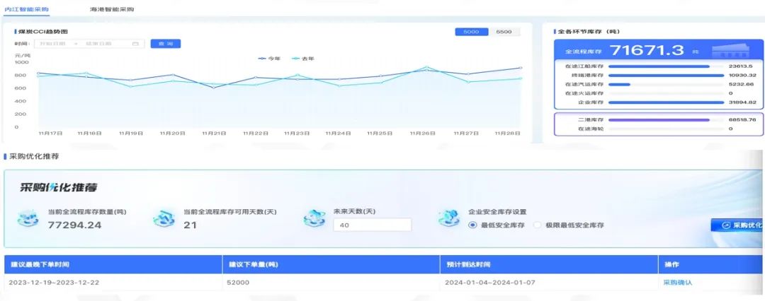 基于CCI指数、全流程库存需求,等数据,开发智能采购模型,实现精准采购下单。基于开停窑、海轮、江轮、赣江过驳、汽运、火运等需求和在途数据,煤炭供应管理业务规则,开发智能派送模型,实现按需配送。智能采购方面通过智能采购推荐,人机结合寻求最佳采购时机。