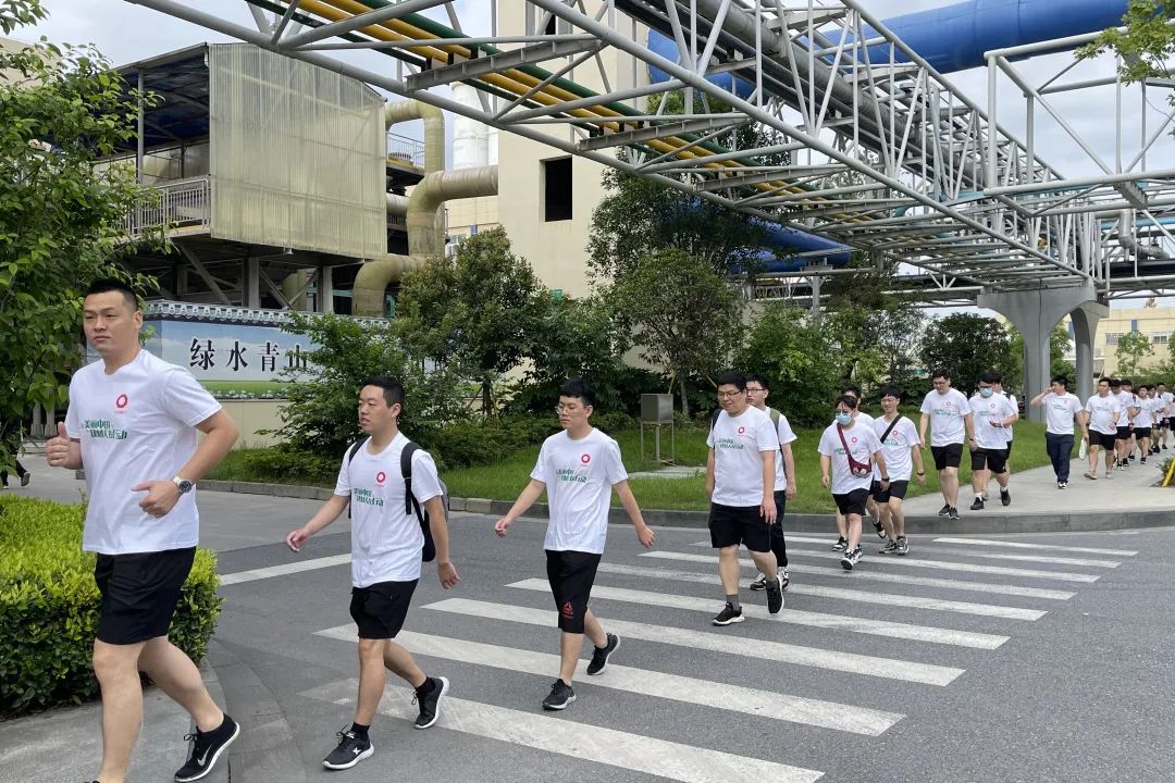 本次“倡导绿色低碳行 重走巨石创业路”徒步活动从智能制造基地出发,白绿相间的徒步队伍,穿梭在现代化的“绿色工厂”步行道上,一旁的“两山”理论、“四不原则”格外显眼,“绿色、低碳、环保!”嘹亮的口号,整齐的队伍,展现出巨石人积极向上的精神风貌。