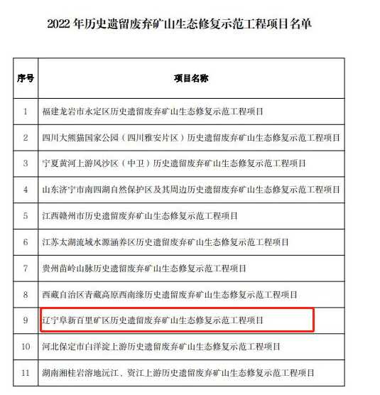 阜新百里矿区历史遗留废弃矿山生态修复示范工程总预算5.16亿元,工程以“绿色屏障、低碳阜新”为目标,通过地形地貌重塑、废弃土地复垦利用、植被恢复等措施,治理历史遗留废弃矿山2.6万亩,构建 “山青、水碧、林郁、田沃、草绿、沙净”的新生态格局,为实现“双碳”目标,维护国家生态安全做出新贡献,为辽宁总队在山水林田湖草沙、历史遗留矿山、双碳等领域业务拓展奠定坚实基础。