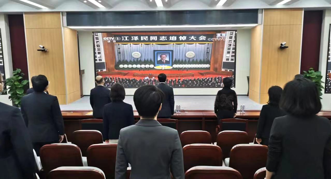 上午10时,江泽民同志追悼大会开始。参加集体收看人员全程肃立,默哀三分钟,认真聆听习近平总书记在追悼大会上所致的悼词,深切缅怀江泽民同志的光辉业绩和崇高风范。追悼大会结束时,大家向江泽民同志遗像深深三鞠躬。