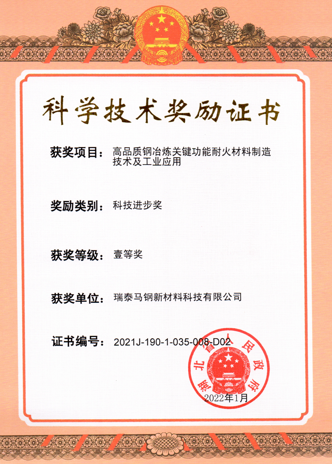 瑞泰马钢荣获湖北省科学技术进步奖一等奖