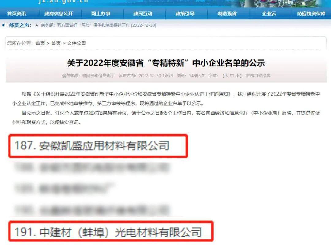 近日,集团所属安徽凯盛应用材料有限公司、中建材(蚌埠)光电材料有限公司获得安徽省“专精特新”中小企业。此次认定是对2家企业在创新能力、研发能力、技术实力、专业化程度等方面的进一步认可,对企业坚持自主创新、深耕技术的高度肯定。