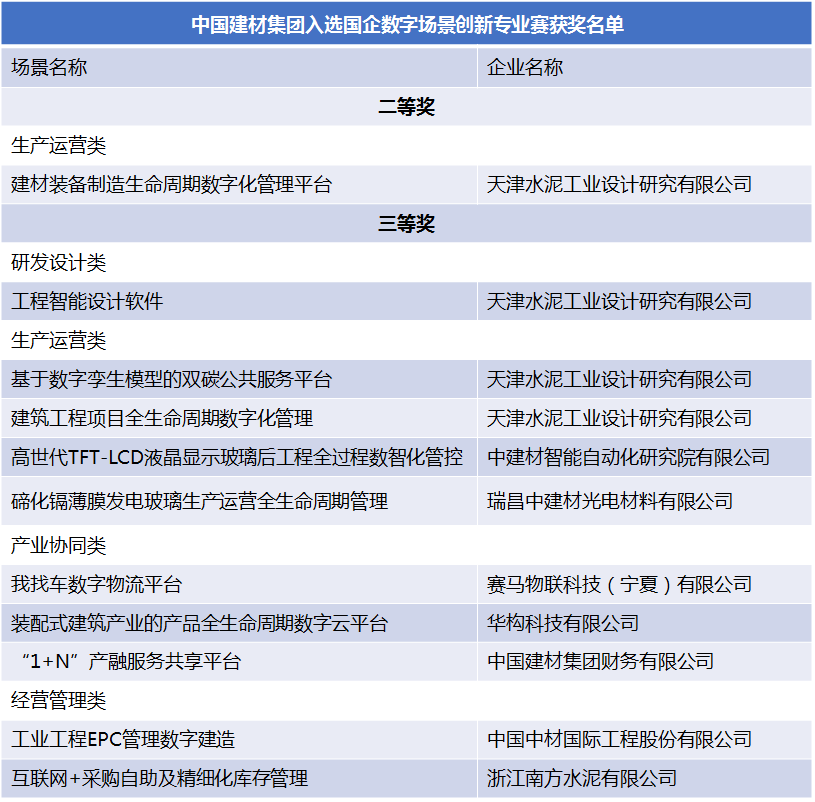 所属共11个场景、8家单位入选该名单。 “国企数字场景创新专业赛”旨在深入贯彻落实党中央、国务院关于加快数字化发展的决策部署,提炼和培育一批数字化转型示范场景,推动数字技术与生产经营深度融合。全国共2007家国有企业3277支队伍报名参赛,获奖场景将在国务院国资委、地方国资委、有关中央企业组织的各项数字化转型交流活动中进行推广展示,并优先纳入国有企业数字化转型示范场景培育清单。 2 凯盛科技与金风科技海得智慧能源深化“双碳”战略合作 近日,凯盛科技与新疆金风科技股份有限公司、浙江海得智慧能源有限公司围绕零碳项目开发建设和解决方案进行战略合作。本次签约既是落实“双碳”的战略部署,也是实现三方业务创新发展、协同发展的重要举措。未来三方将基于各自在新能源领域的产品、解决方案、服务等优势和国际化资源渠道,共享全球市场网络资源,实现互惠互利、合作共赢。 3 国家新材料重点平台-测试评价平台先进无机非金属材料行业中心获工信部授牌 近日,工业和信息化部组织召开国家新材料重点平台工作会,国检集团承担建设的国家新材料重点平台-测试评价平台先进无机非金属材料行业中心获得工信部授牌。未来,国检集团将继续以无机非金属新材料专业质量认证评价为抓手,围绕无机非金属新材料工程应用和服务国家重大战略需求,持续提升创新和服务能力,深入开展新材料领域的测试评价技术攻关,完善市场化运营模式,着力在深化产业链供应链韧性和安全水平、构建新材料全新增长引擎、优化产业创新生态上下大力气,更好地发挥国家测试评价平台公共服务作用。 4 中材节能与京东物流集团签订战略合作协议 近日,中材节能与京东物流集团在津举行战略合作签约仪式。未来,双方将借助自身优势展开更高层次、更宽领域的深度合作,共同探索低碳物流解决方案与更多的市场应用场景,共同打造更多的精品项目,推动彼此行业的发展,实现共赢。 5 中建材绿色能源有限公司与华宝证券股份有限公司在京签署战略合作协议 近日,中建材绿色能源有限公司与华宝证券股份有限公司签署了战略合作协议。未来双方将在碳金融创新领域寻求合作机会,致力于碳资产盘活,挖掘碳交易在金融资本和实体经济之间的联通作用。本次签约对于中建材绿色能源有限公司进一步扩展央企跨行业碳交易协同具有重要意义。 6 秦皇岛院与广东明轩签订工程总承包合同 近日,秦皇岛院与广东明轩实业有限公司在中国国际玻璃展览会现场举行签约仪式。在未来的项目建设中,秦皇岛院将充分发挥自身在玻璃工程建设服务领域的技术优势,以客户需求为先导,着力打造高品质项目,为客户高质量发展赋能。 7 南轻包装成功中标万和电气泰国1300飞剪和1600分条机项目 近日,南轻包装成功中标万和电气泰国1300飞剪和1600分条机项目,标志着南轻包装在板材深加工装备研发、制造领域取得了新突破,产品在东南亚市场的知名度和竞争力得到进一步提升。