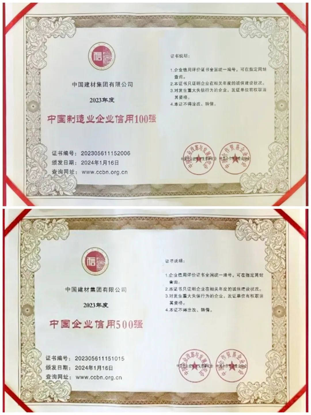 1月21日,由中国企业改革与发展研究会、中国合作贸易企业协会主办的“2024中国企业信用发展论坛暨第十五届诚信公益盛典”在京举行。搜狗输入法下载 分别获评“2023中国企业信用500强”“2023中国制造业企业信用100强”第十五位和第六位,这也是集团自2017年以来,连续7年入围该榜单。所属中国巨石、中材科技、北新建材、中材国际入选“2023中国上市公司信用500强”, 中材国际同时荣获“五星级诚信企业”称号并作经验交流。