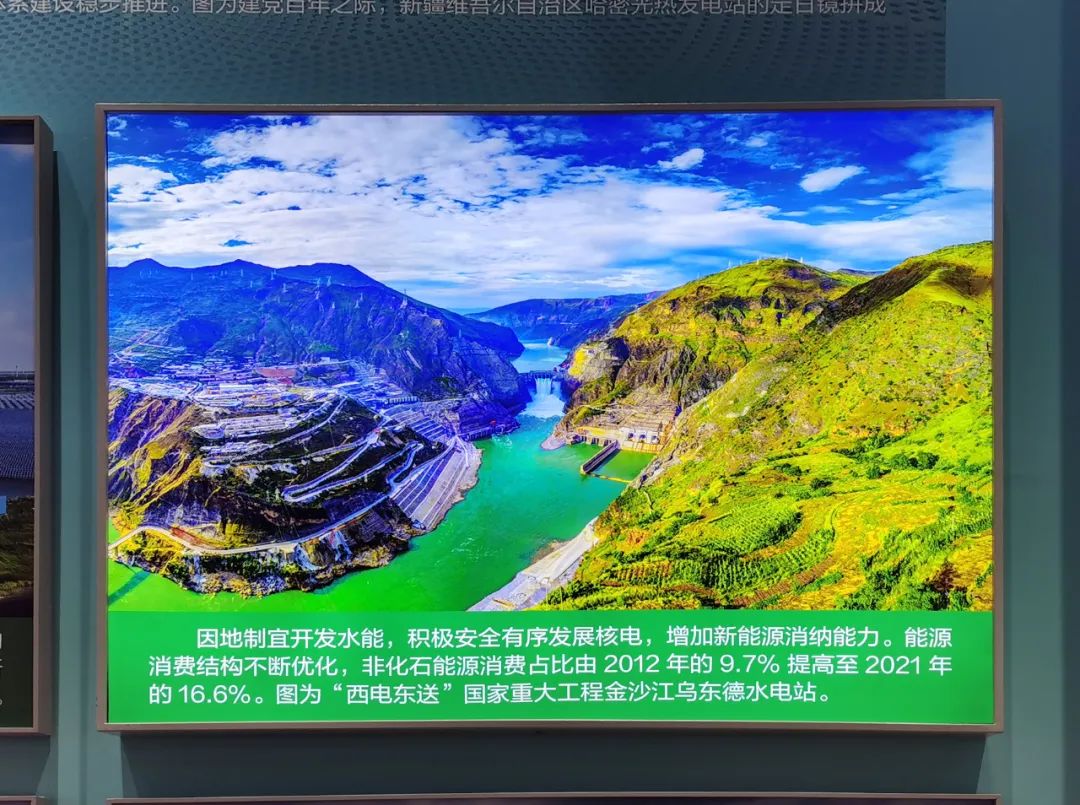 29项中国建材元素亮相成就展: 坚持创新驱动 建设材料强国 我们突破“卡脖子”技术、自主研制量产的SYT45、SYT55高强高模碳纤维,超细电子玻璃纤维BC3000,30微米柔性可折叠玻璃,以及我国首条拥有自主知识产权的8.5代TFT-LCD玻璃基板示范线。 我们多项高精尖材料助力空间站核心舱、天问一号着陆器、祝融号火星车、神舟飞船、高分六号卫星、“墨子号”量子卫星、“吉林一号”卫星、航空发动机、C919大型客机、鲲龙号AG600两栖飞机等航天航空工程。 我们多项新材料成功应用于白鹤滩水电站、乌东德水电站、北京冬奥场馆、北京城市副中心、世界园艺博览会中国馆、雁西湖国际会都、中国尊、大兴国际机场、内蒙古自治区乌兰察布风电场、山西朔州平鲁禹丰风电场、吉林白城通榆风电场、内蒙古自治区锡林郭勒盟特高压输电项目等国家重大工程。 我们勇担央企责任,鼎力驰援湖北武汉抗击新冠疫情。 我们积极参与脱贫攻坚和乡村振兴,定点帮扶5个区县全部如期脱贫出列。图为我们援建的云南昭通市昭阳区苹果基地喜获丰收。 干部职工参展体会: