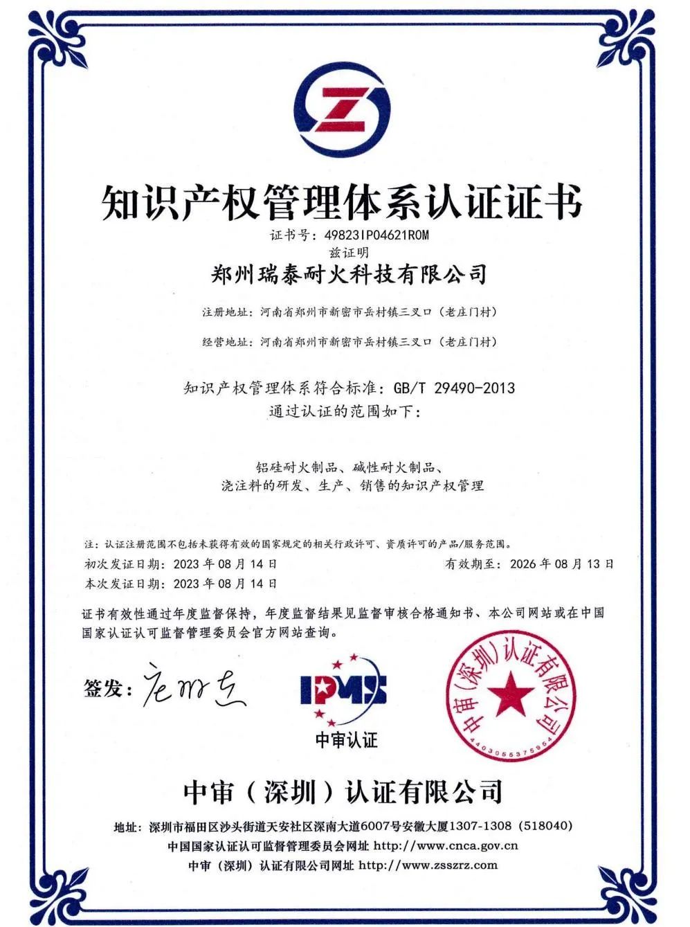 近日,郑州瑞泰顺利通过GB/T29490-2013知识产权管理体系认证并取得证书,这标志着公司在知识产权管理规范化标准化运行方面获得认可,进一步增强了市场竞争力。