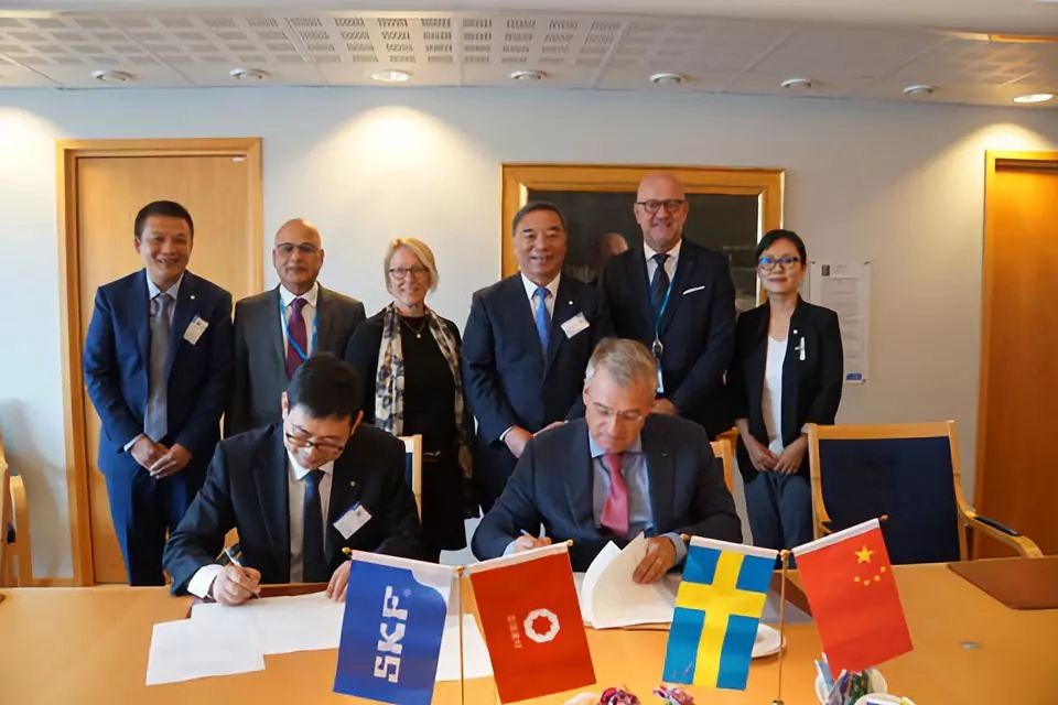 9月7日,宋志平应邀拜访了世界***的轴承企业瑞典斯凯孚(SKF)集团哥德堡总部。SKF集团总裁兼首席执行官邓立信率首席技术官、创新与业务发展总裁文雅丽,工业技术总裁托马斯·弗洛斯德,SKF子公司Vesta Si总经理桑托斯等主要管理团队成员对代表团的来访表示欢迎。邓立信首先介绍了SKF的基本情况,展示了氮化硅轴承、车用联轴器等核心产品,随后陪同参观了SKF全自动、智能化、数字化的轴承生产线。